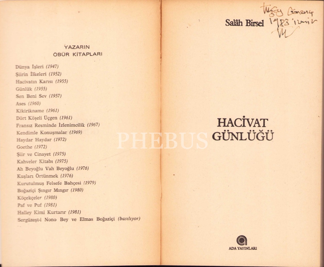Hacivat Günlüğü, Salâh Birsel, Ada Yayınları, İstanbul 1982, 302 syf., 12x19 cm