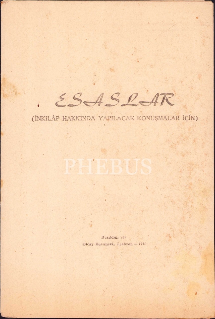 Esaslar (İnkılâp Hakkında Yapılacak Konuşmalar İçin), Olcay Basımevi, Trabzon 1960, 20 syf., 16x24 cm