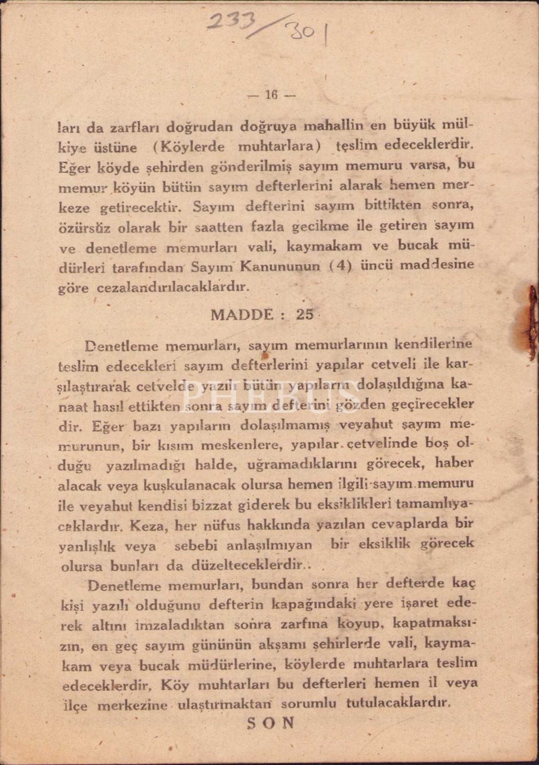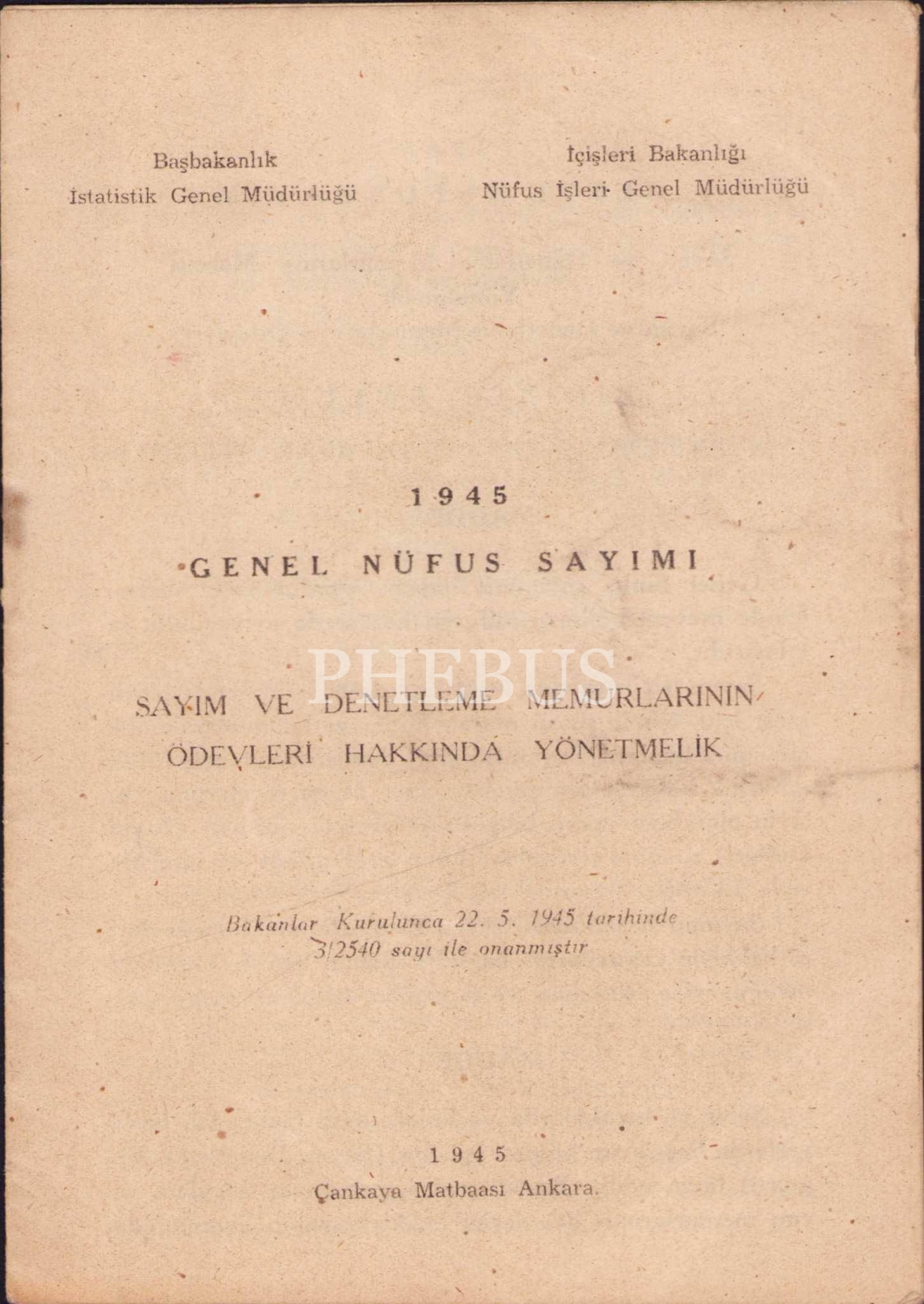 1945 Genel Nüfus Sayımı (Sayım ve Denetleme Memurlarının Ödevleri Hakkında Yönetmelik), Çankaya Matbaası, Ankara 1945, 16 syf., 12x17 cm