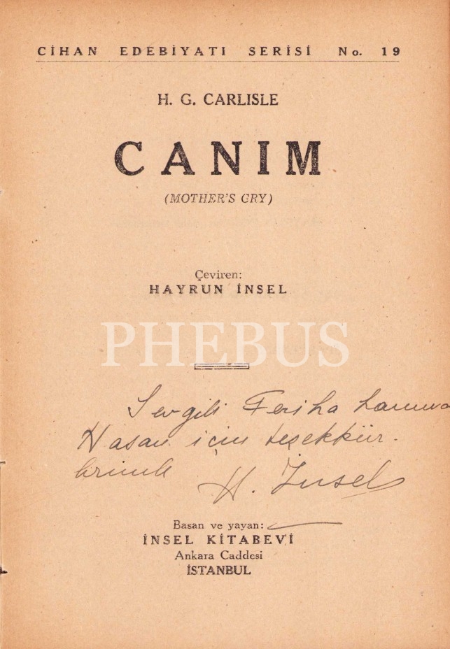 Tercüme Eden Hayrun İnsel'den ithaflı ve imzalı "Canım", H. G. Carlisle, İnsel Kitabevi, 1945, 110 sayfa, 14x20 cm