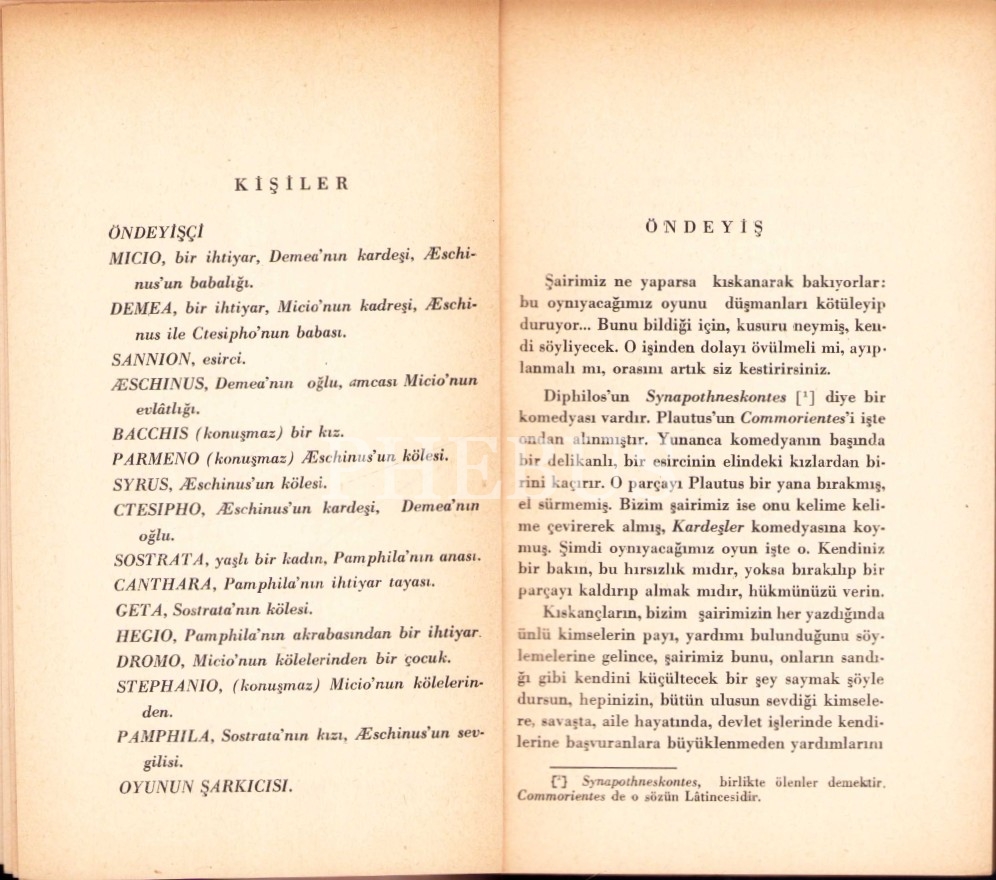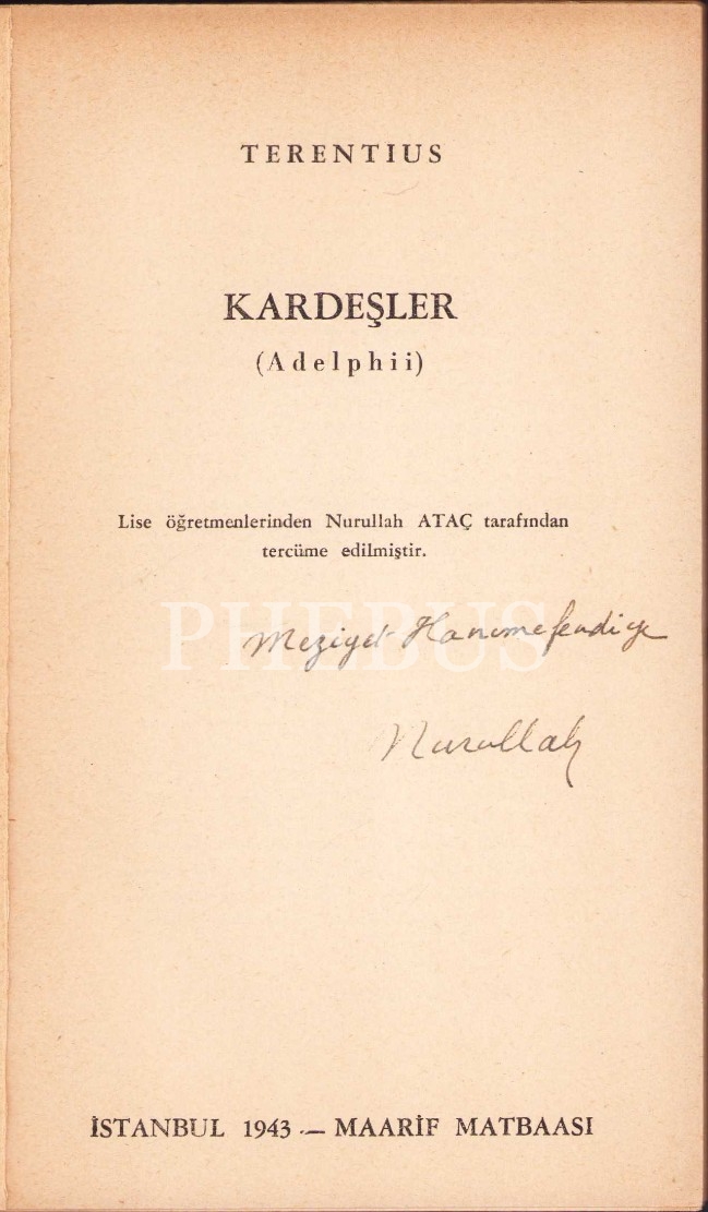 Tercüme Eden Nurullah Ataç'tan İmzalı ve İthaflı "Terentius: Kardeşler", 1943, Maarif Matbaası, 80 sayfa, haliyle