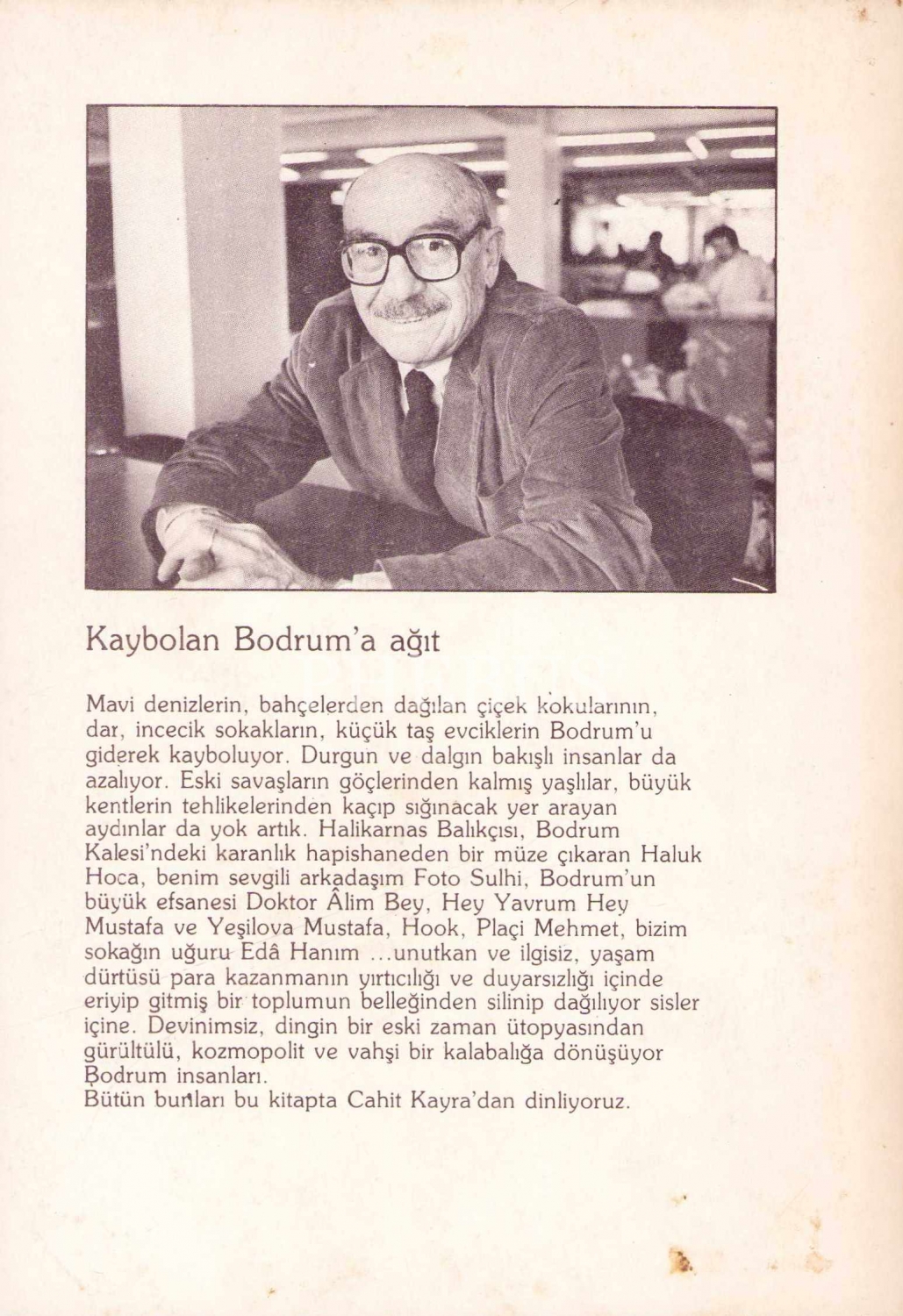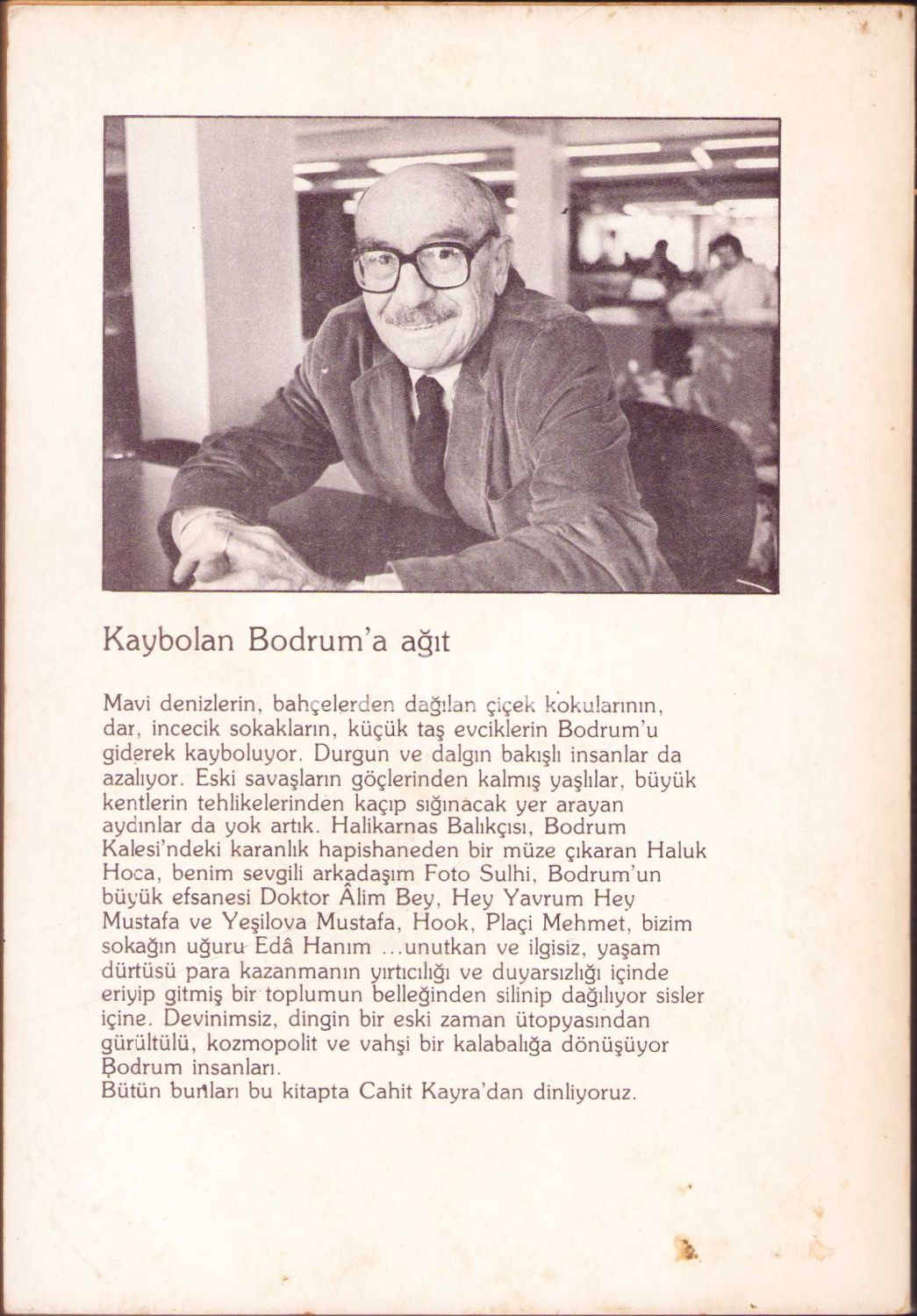 İthaf "Sayın Mücaf Ofluoğlu, Bize bir zevk-i tahassür kaldı, şu sönen, gölgelenen Bodrum'dan sevgilerle, 25 Mayıs 1989 C. Kayra" şeklindedir