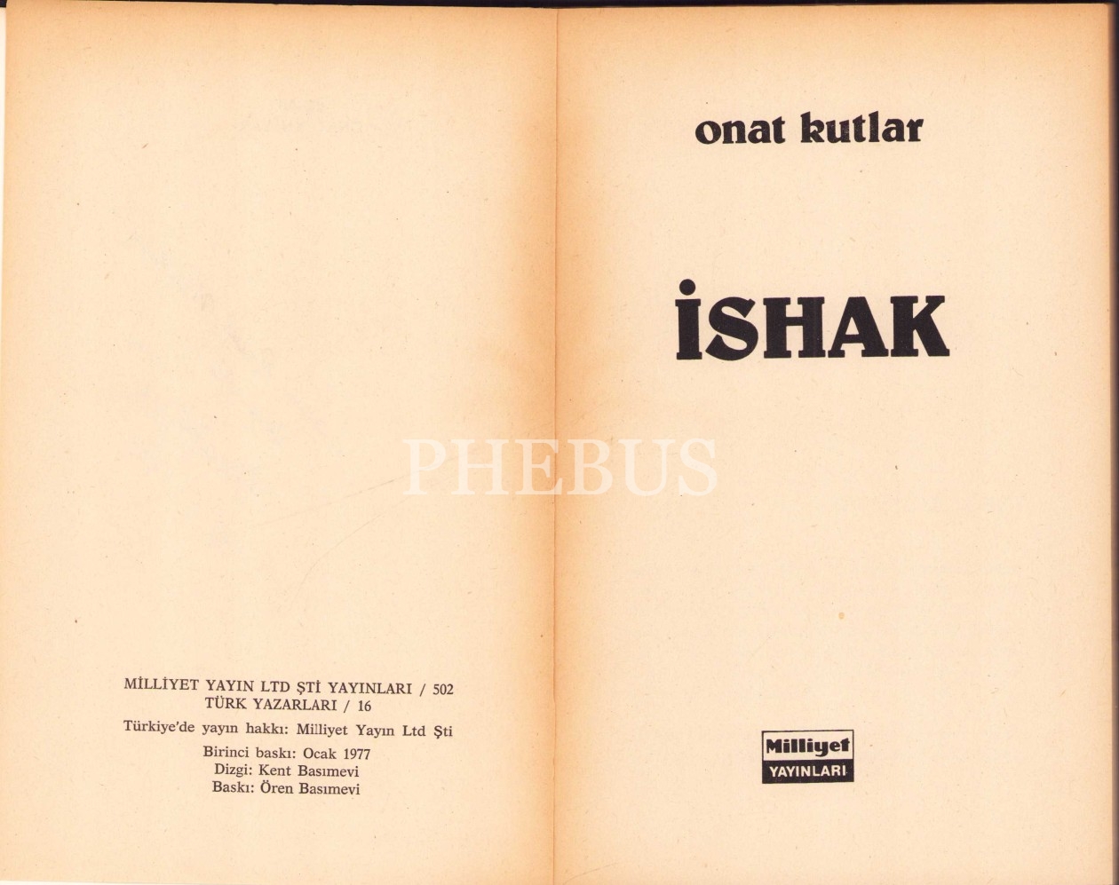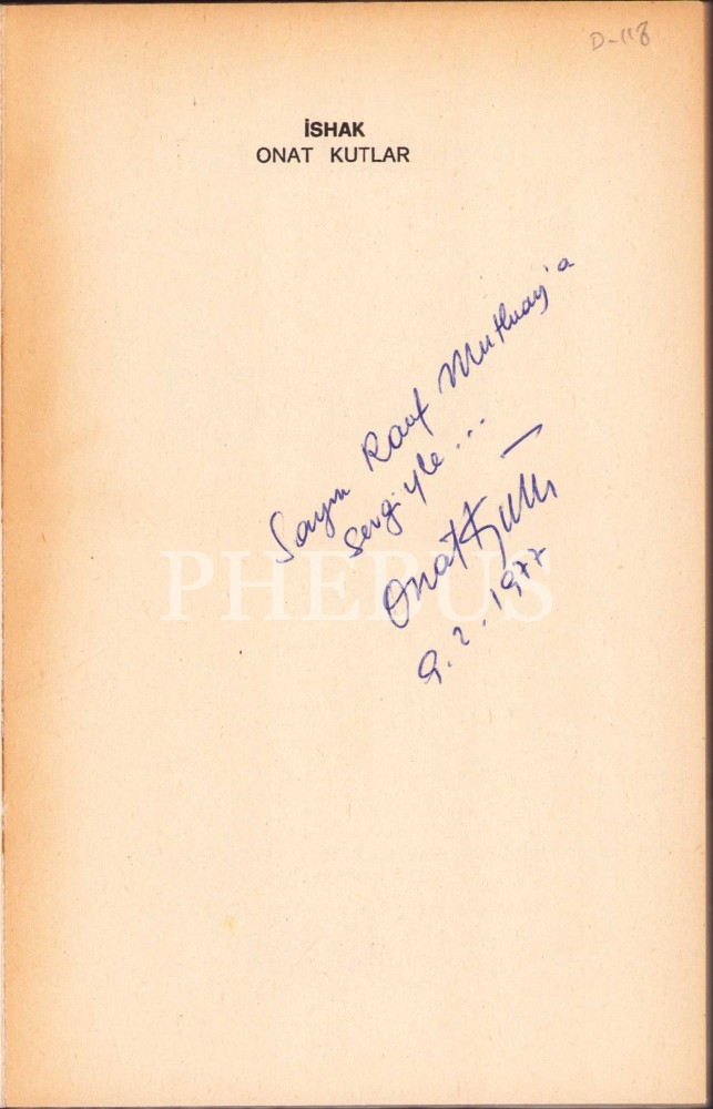Onat Kutlar'dan Edebiyat Araştırmacısı Rauf Mutluay'a İthaflı ve İmzalı: İshak, İlk Baskı, 1977, Milliyet Yayınları, 98 sayfa