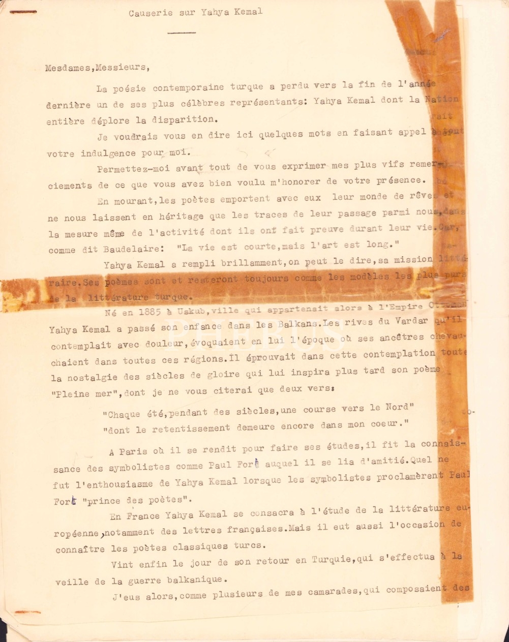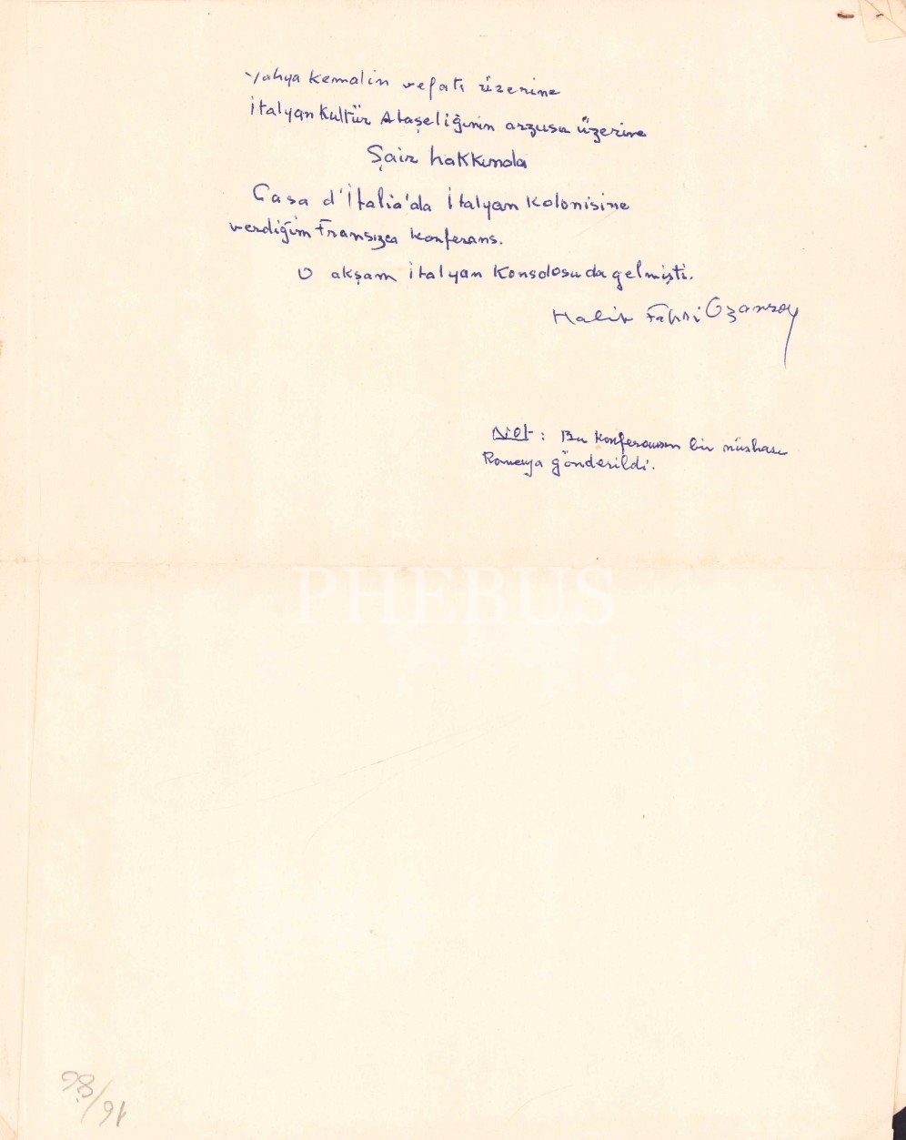 Halit Fahri Ozansoy'un Yahya Kemal'in Vefatı Üzerine İtalya'da Verdiği Fransızca Konferans Metni, 23x30 cm