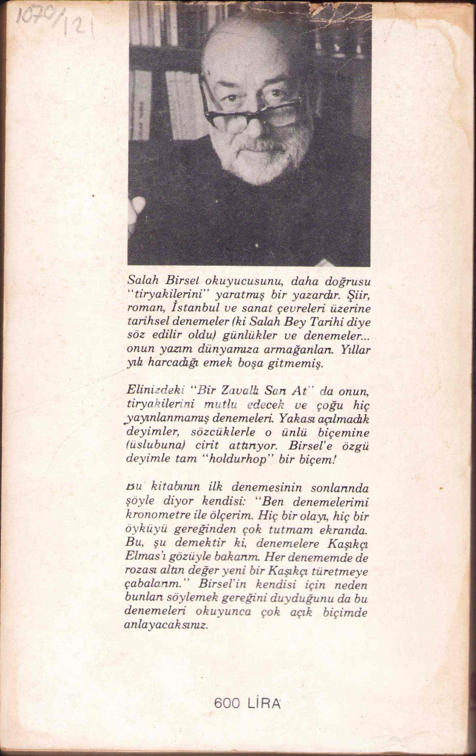 Şair ve deneme yazarı Salâh Birsel 1919’da doğdu. İlk şiiri 1937’de Gündüz dergisinde yayınlanmıştır. Günlüklerini 1950’de Beş Sanat dergisinde yayımlamaya başladı. Türk şiirinde özgün bir yer edinen Birsel daha çok aklın ve zekânın egemenliğini ön planda tutan, şairanelikten uzak, yergici şiirlere ağırlık verdi. Asıl ününü 1970’den sonra yayımladığı 1001 Gece Denemeleri ve Salâh Bey Tarihi olarak adlandırdığı dizi kitapları ve günlükleriyle elde etti.1999’da vefat etmiştir.