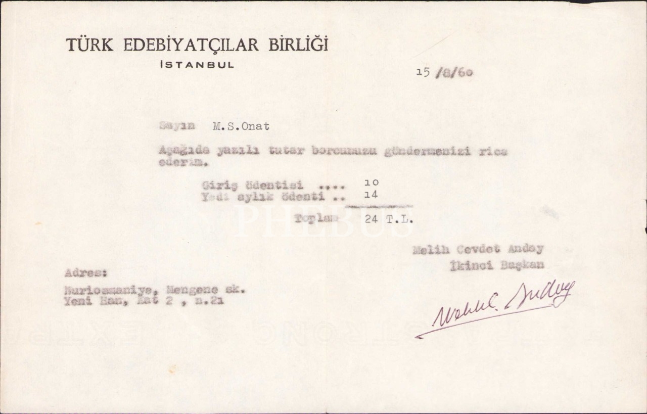 Şair Melih Cevdet Anday Islak İmzalı Türk Edebiyatçılar Birliği İstanbul Antetli Belge, 23x15 cm