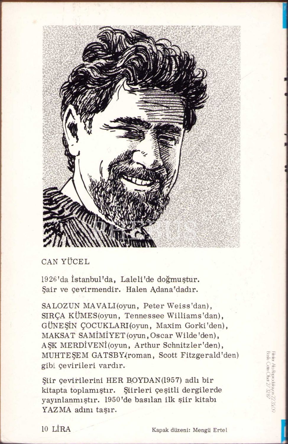 Can Yücel (1926-1999) Türk şair, mütercim. Millî Eğitim Bakanlığı yapan Hasan Âli Yücel'in oğludur. Ankara ve Cambridge üniversitelerinde Latince ve Yunanca okudu. Londra’da BBC’nin Türkçe bölümünde spikerlik yaptı. 1958’de Türkiye’ye döndükten sonra bir süre Bodrum ve Marmaris’te turist rehberi olarak çalıştı. Can Yücel, taşlama ve toplumsal duyarlılığın ağır bastığı şiirlerinde, yalın dili ve buluşları ile dikkati çekti. Yazma, Sevgi Duvarı, Bir Siyasinin Şiirleri, Ölüm ve Oğlum, Rengâhenk, Maaile, Mekânım Datça Olsun yayınladığı bazı şiir kitaplarıdır.