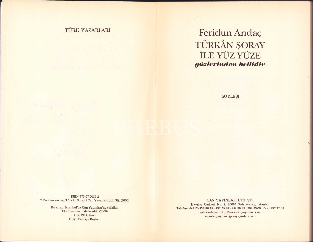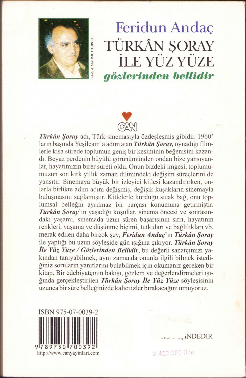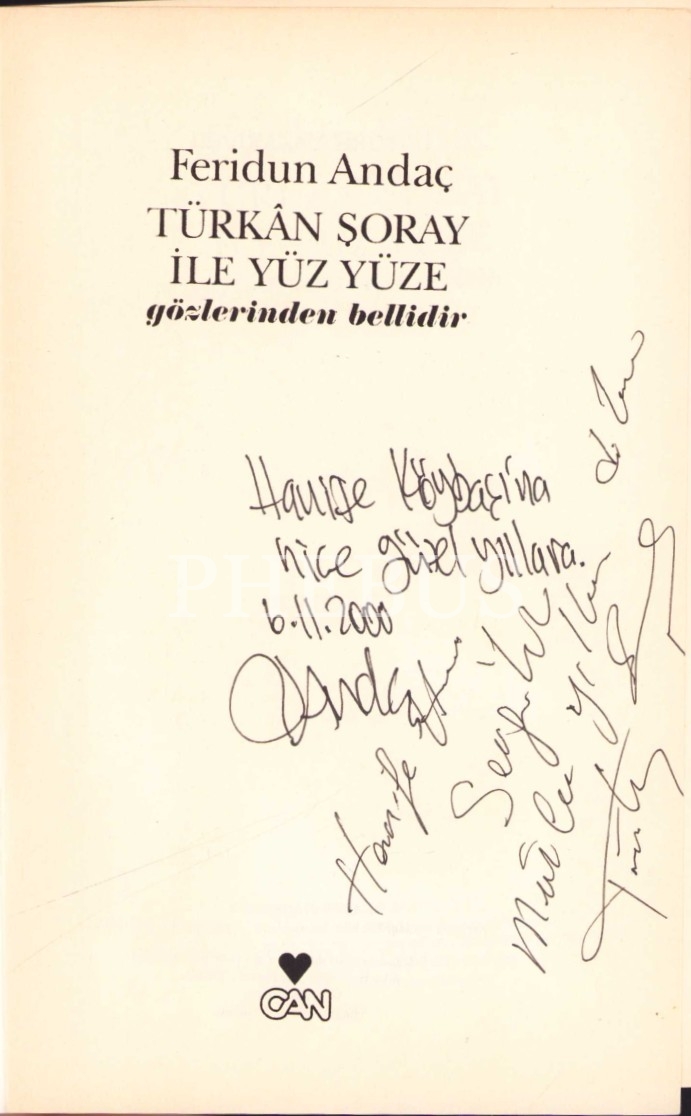 Feridun Andaç "Türkan Şoray İle Yüz Yüze -Gözlerinden Bellidir-", Feridun Andaç'tan ve Türkan Şoray'dan İthaflı ve İmzalı, 2000 Can Yayınları, 140 sayfa