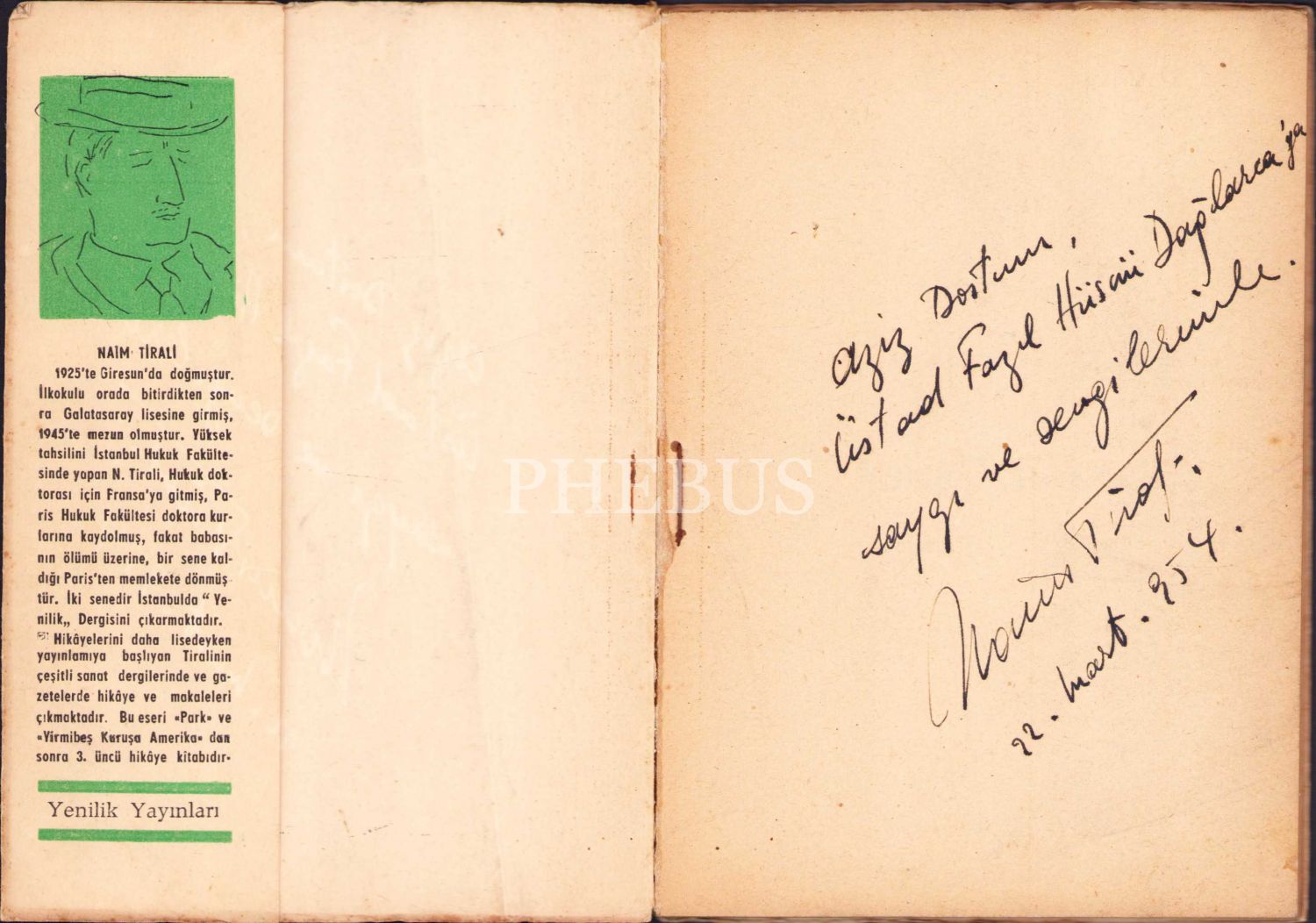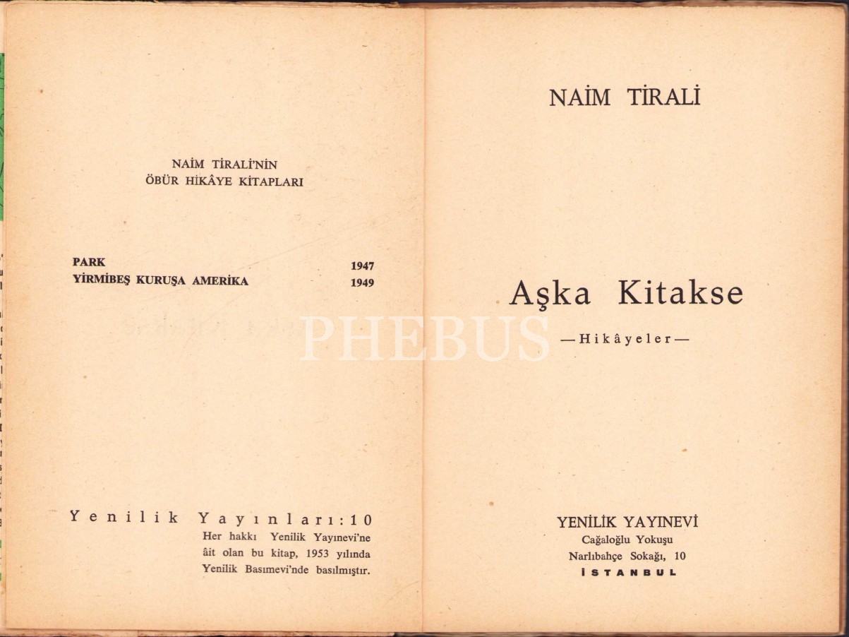 İthaf "Aziz Dostum Üstad Fazıl Hüsnü Dağlarca'ya saygı ve sevgilerimle Naim Tirali 22.Mart.954" şeklindedir.Naim Tirali, Giresun'da doğdu. İlkokulu Piraziz ve Giresun'da okudu. Orta öğrenimini Galatasaray Lisesi'nde yapmıştır. Öyküler yazmaya henüz lise çağlarında başlayan Naim Tirali'nin ilk öyküsünü 1943 yılında Yeşil Giresun gazetesinde, ilk kitabı Park 1948'te yayınlanmıştır. 1946 yılında Giresun'da Karadeniz Postası gazetesini çıkaran Tirali İstanbul Üniversitesi Hukuk Fakültesi mezunudur. Hukuk doktorası için Paris'te bir yıl kalıp yurda dönmüştür. 1950'li yıllarda yayımcılıkla da ilgilenen Naim Tirali, Yenilik matbaasını kurmuş ve aynı adlı dergiyi beş yıl boyunca yayımlamıştır. 1956 yılında Vatan gazetesine girmiş , 1962'de Ahmet Emin Yalman'ın sahibi olduğu Vatan gazetesinin tüm hisselerini satın alarak gazete sahibi olarak 1975 yılına kadar Ankara ve İstanbul'da yayınını devam ettirmiştir. Tirali, 1960'ta Pulliam davasından dolayı 1959 yazı işleri müdürüyken, bir Amerikalı yazarın Adnan Menderes'i eleştiren yazısını yayımlaması nedeniyle 16 ay hapse mahkûm olup hapse girmiştir. Bu dönemde öykü kitapları Yirmibeş Kuruşa Amerika ve Aşka Kitakse'yi yayımlamıştır. 1977 yılında basın şeref kartı almıştır.
