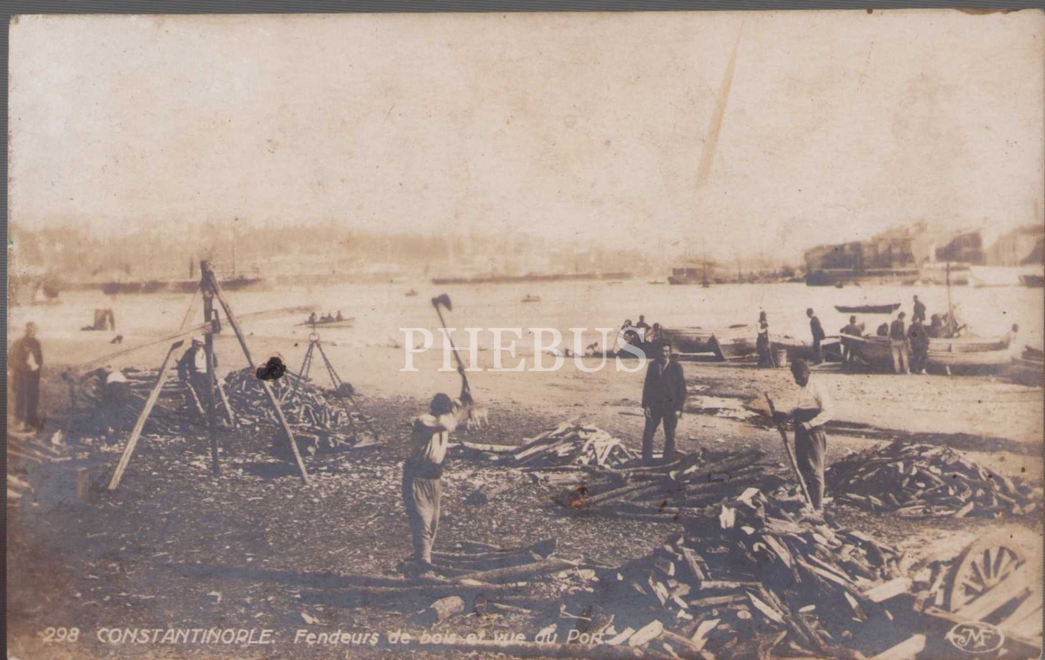 Osmanlı Dönemi Kartpostal, İstanbul Limanı'nda Odun Kıranlar Nadir Kartpostal, Constantinople, Fransızca, 14x9 cm