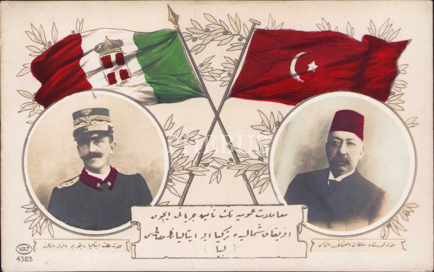 Osmanlı Dönemi Kartpostal, Libya [Trablusgarb] Savaşı'nın Sulhu Dolayısıyla, Sultan Mehmed Reşad ve İtalya Kralı, 9x14 cm