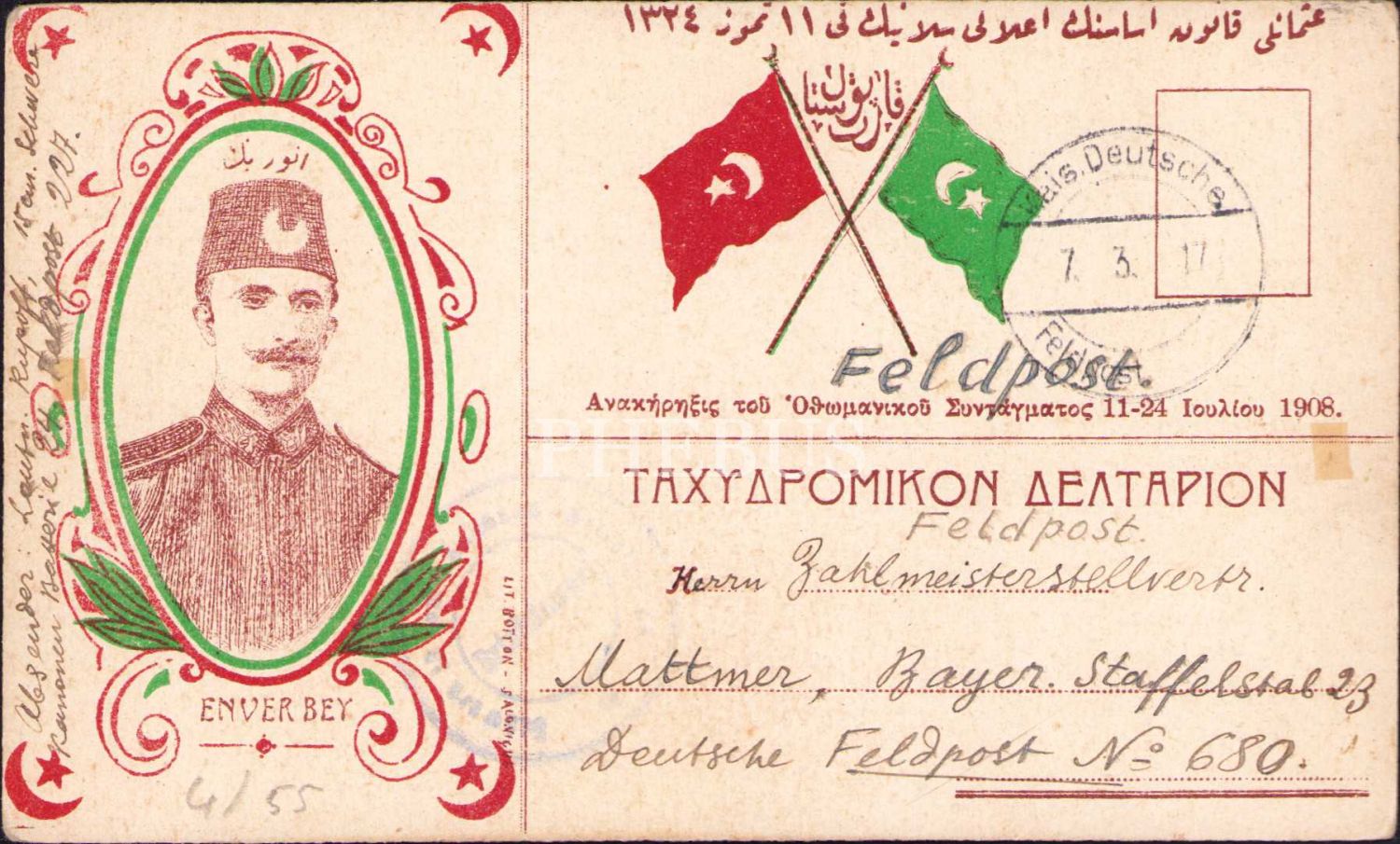 Osmanlı Dönemi Osmanlıca ve Rumca İkinci Meşrutiyet Temalı Kartpostal, Enver Paşa, Meşrutiyet bayraklı, arkası Almanca, 9x14 cm