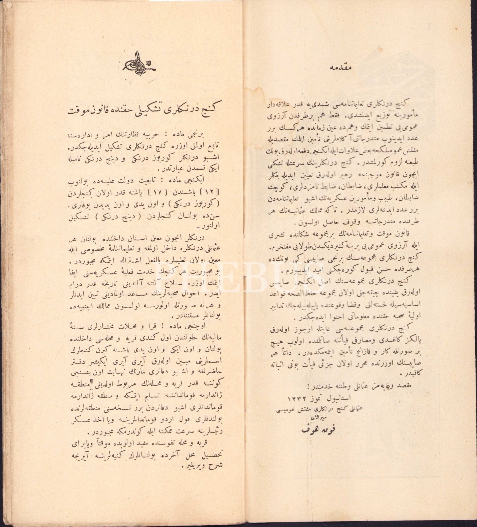 Osmanlı Genç Dernekleri Teşekkülü Hakkında Kanun-ı Muvakkat [Geçici Kanun] ve Talimatname, Genç Dernekleri Kütüphanesi, Von Hof, Evkaf-ı İslamiye Matbaası, 1334 tarihli, 35 sayfa, 11x24 cm