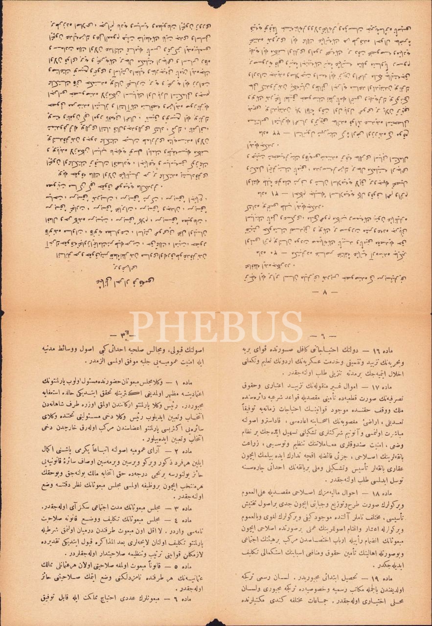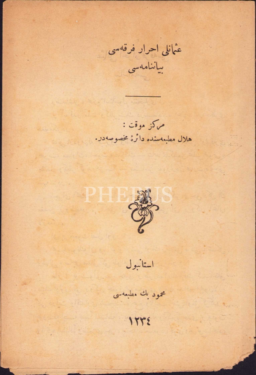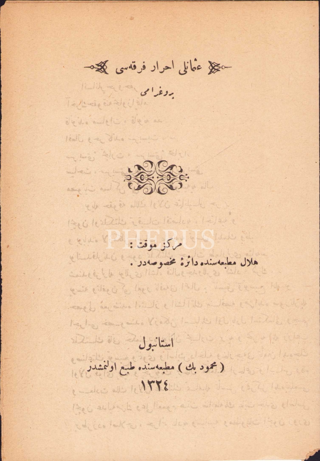 Osmanlı Ahrar Fırkası Beyannamesi ve Osmanlı Ahrar Fırkası Programı, İstanbul, 1324 tarihli, Osmanlıca, Mahmud Bey Matbaası, 13+8 sayfa, iki parça, 13x18 cm