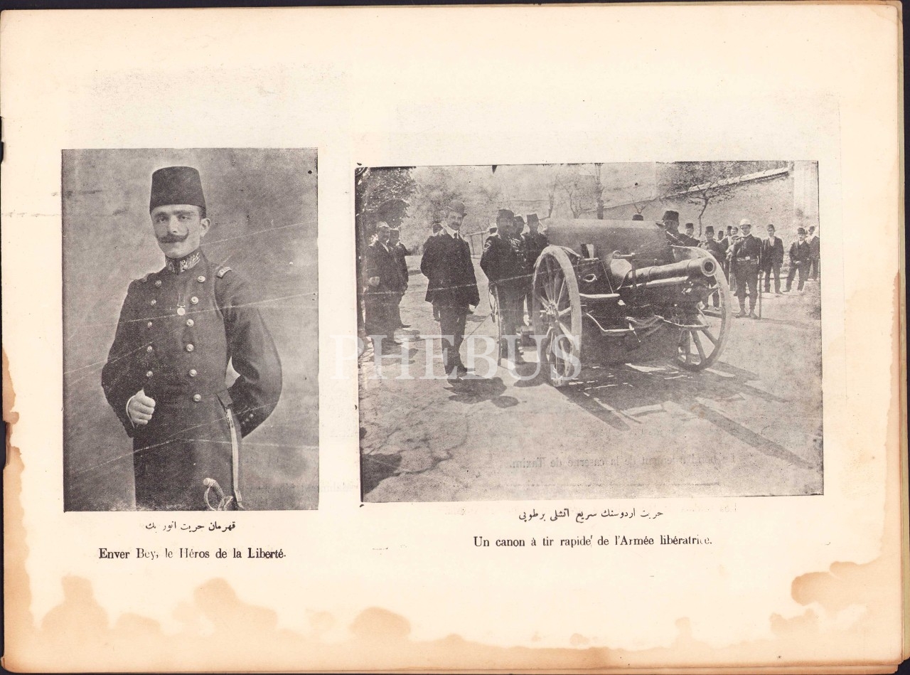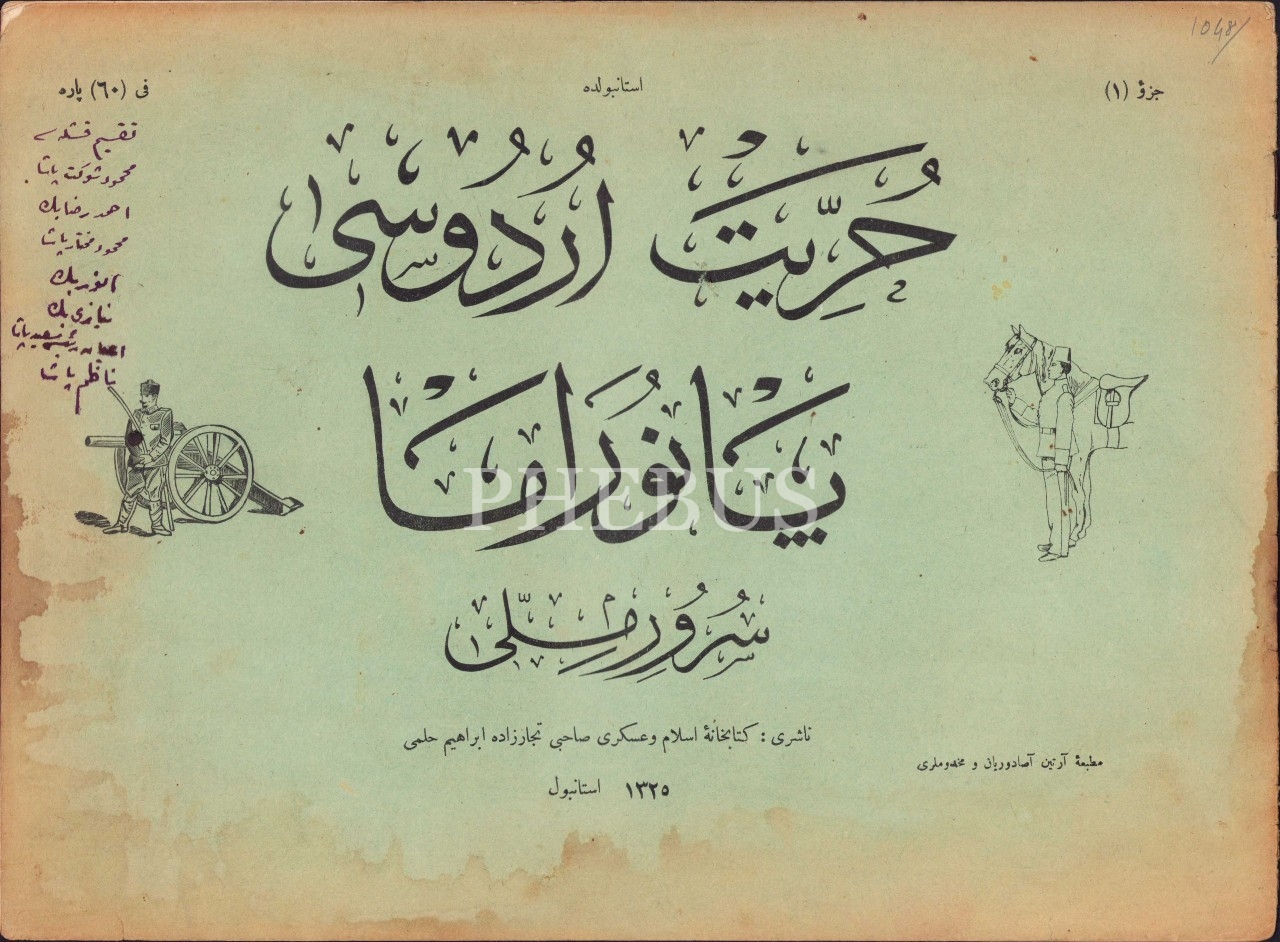 Osmanlıca İstanbul'da Hürriyet Ordusu Panaroması, 1. Cüz, 1325 tarihli, İstanbul, Artin Asaduryan Matbaası, Osmanlıca ve Fransızca, haliyle, 34x24 cm