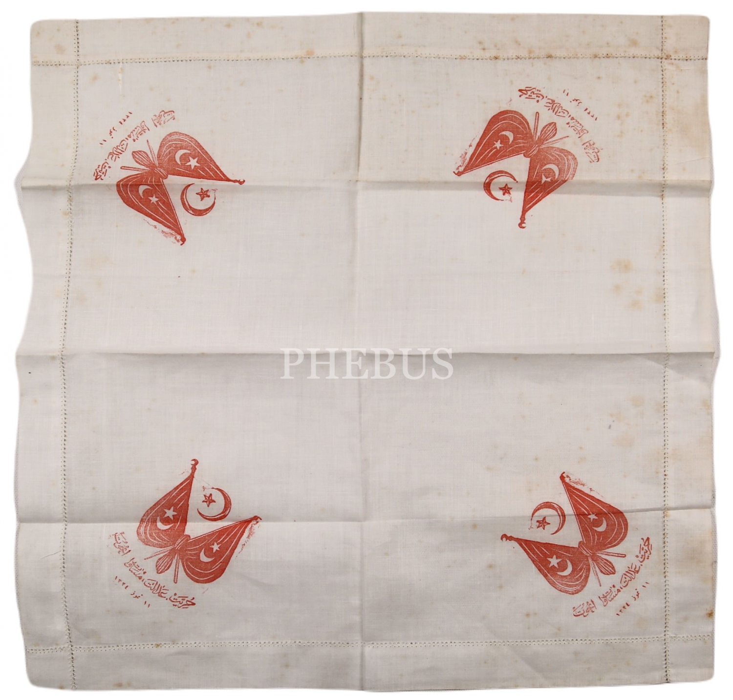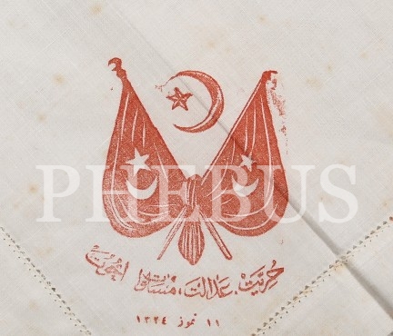 Meşrutiyet Bayraklı ve Osmanlıca "Hürriyet Adalet Müsavat ve Uhuvvet" yazılı mendil, 34x34 cm