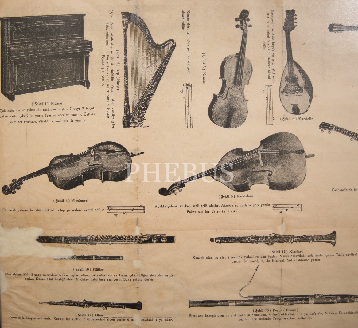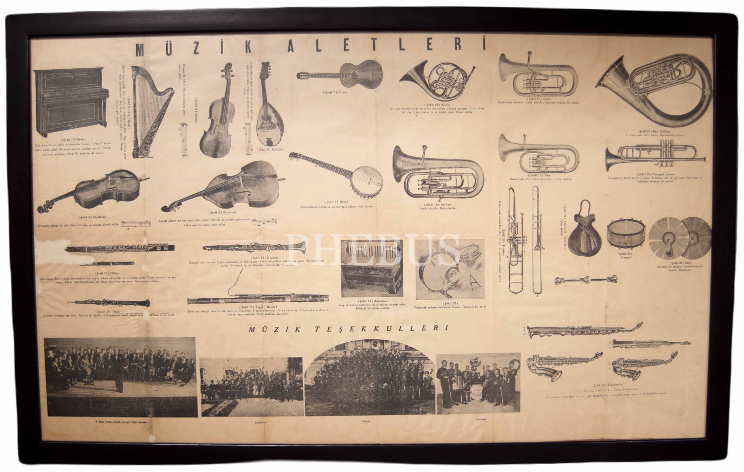 Erken Dönem Büyük Boy Çerçeveli Müzik Aletleri Afişi, 86x53 cm