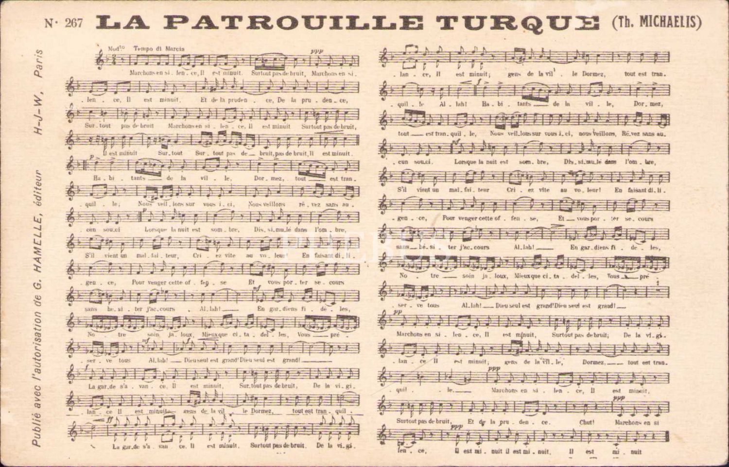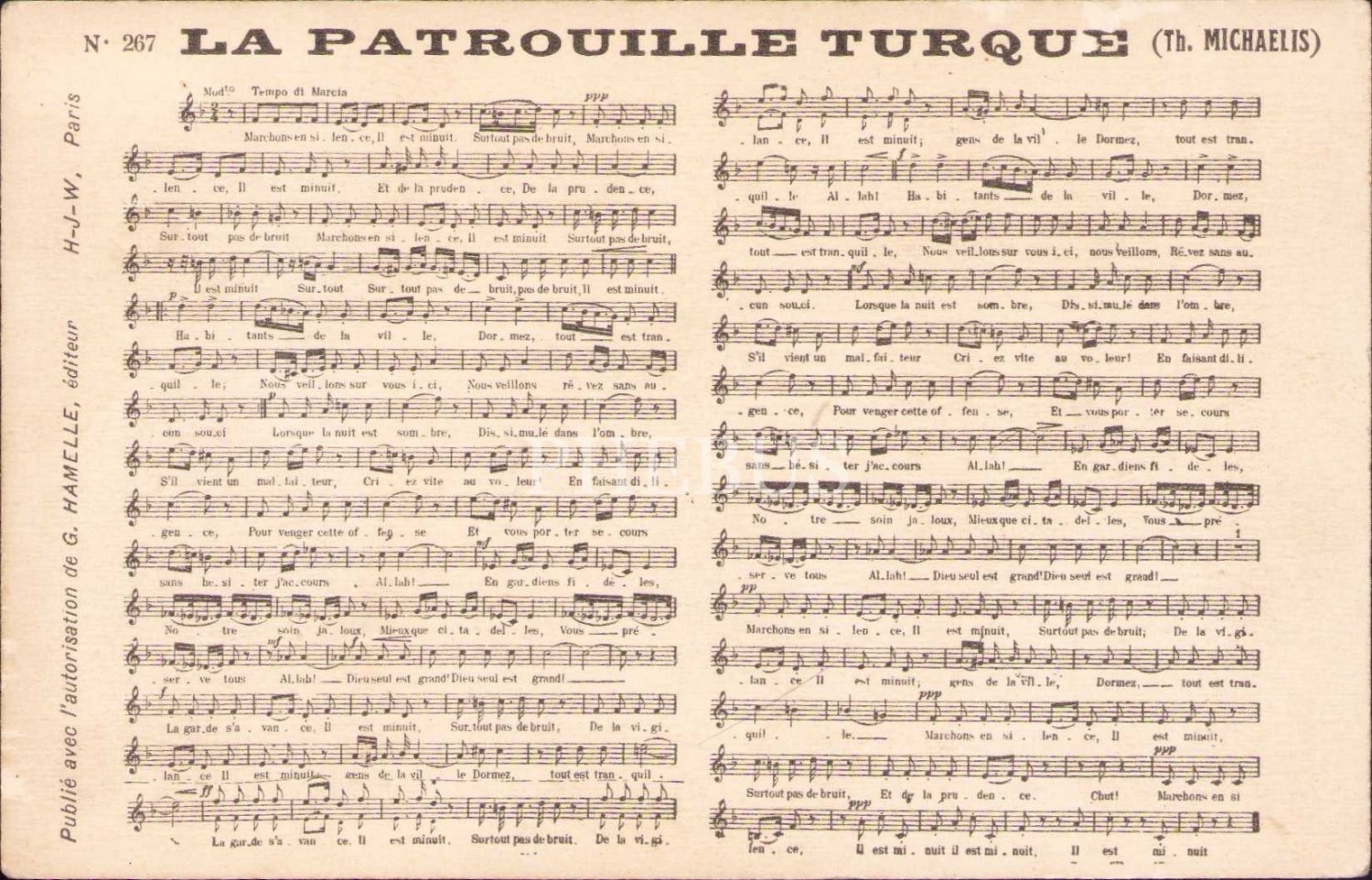 Osmanlıca Nota Kartpostalı, "La Patrouille Turque" [Türk Devriyesi], Editör: G. Hamelle, 14x10 cm
