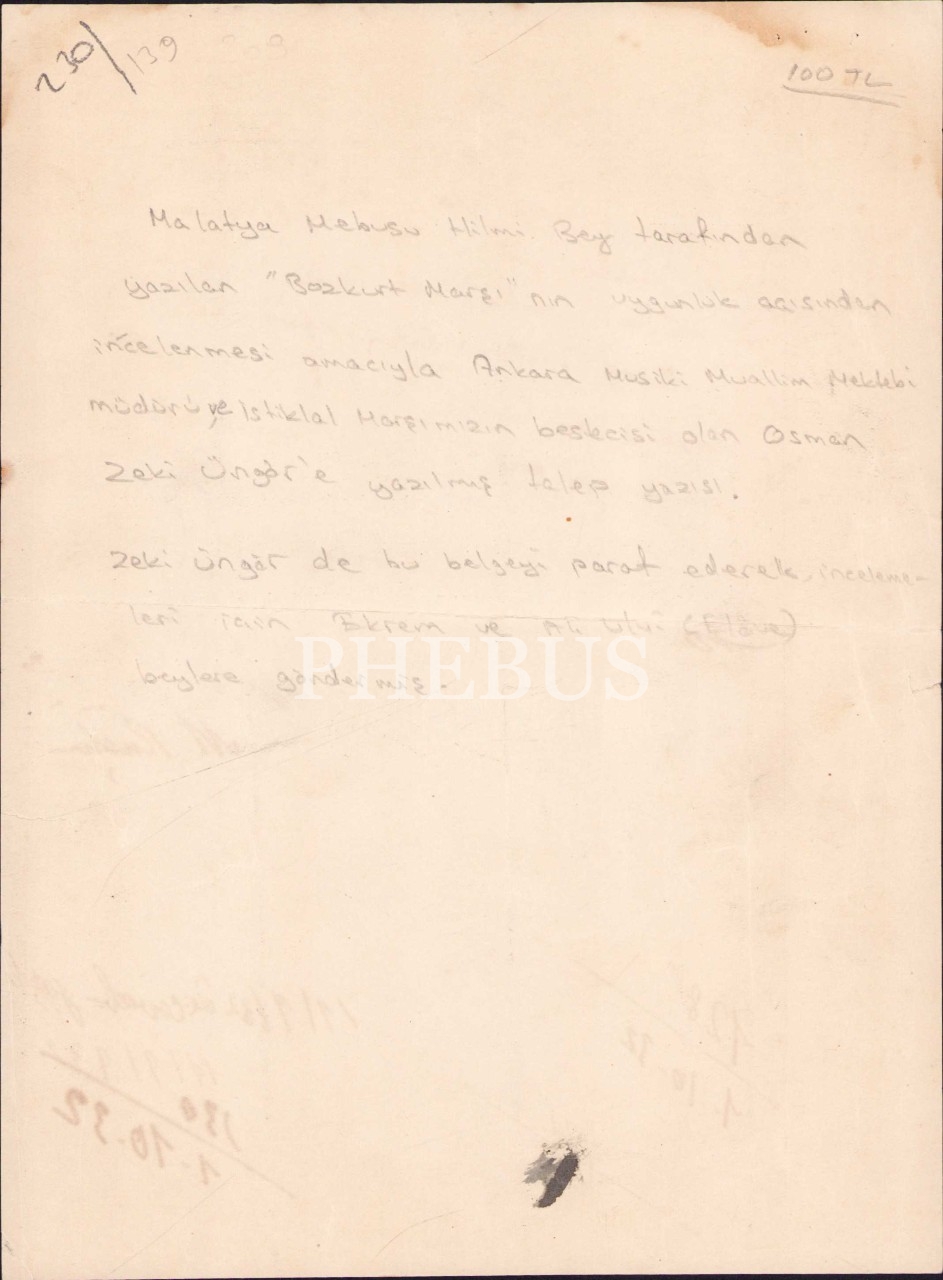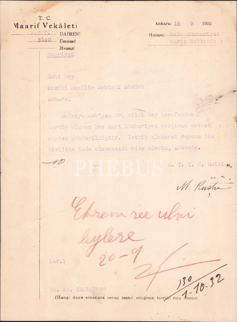Halk Cumhuriyet Marşı Hakkında Zeki Üngör'e Gönderilmiş Maarif Vekaleti antetli belge, 1932, 18x25 cm