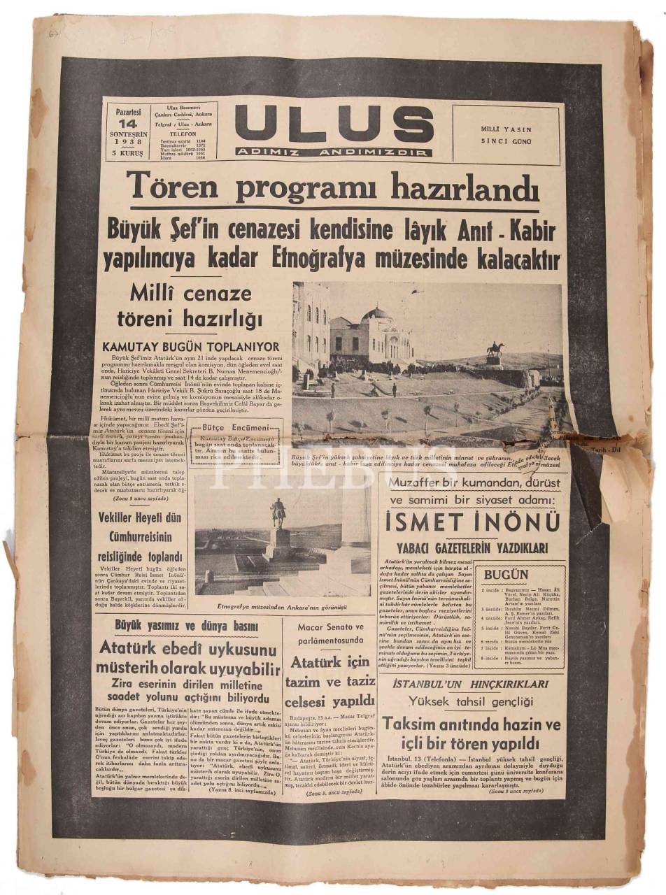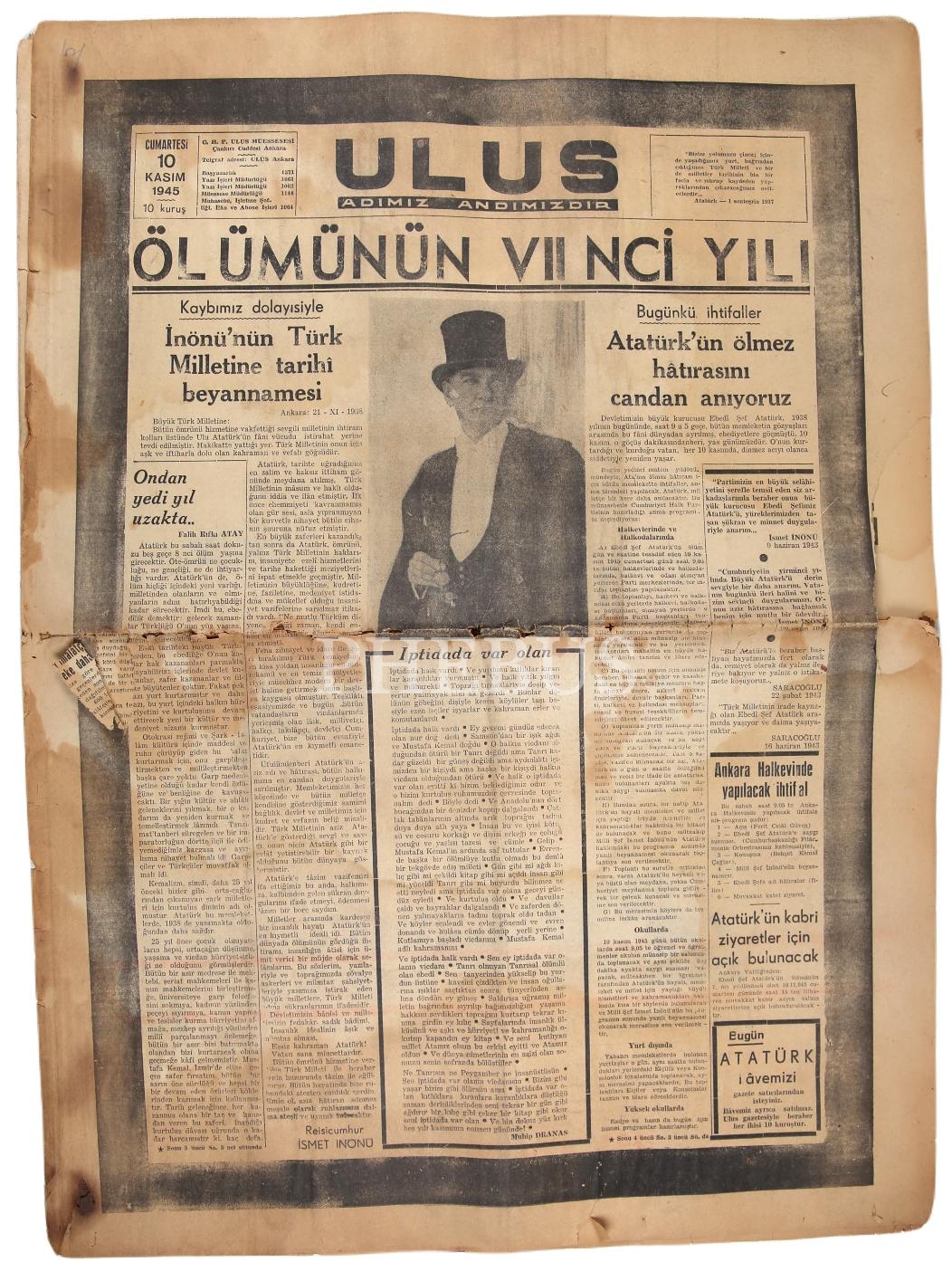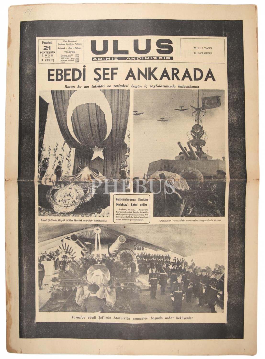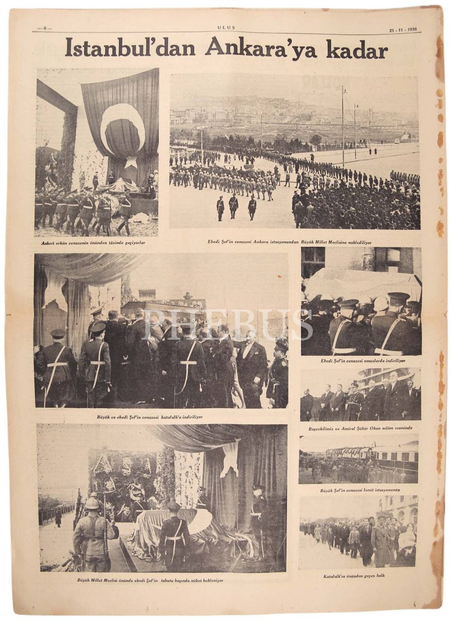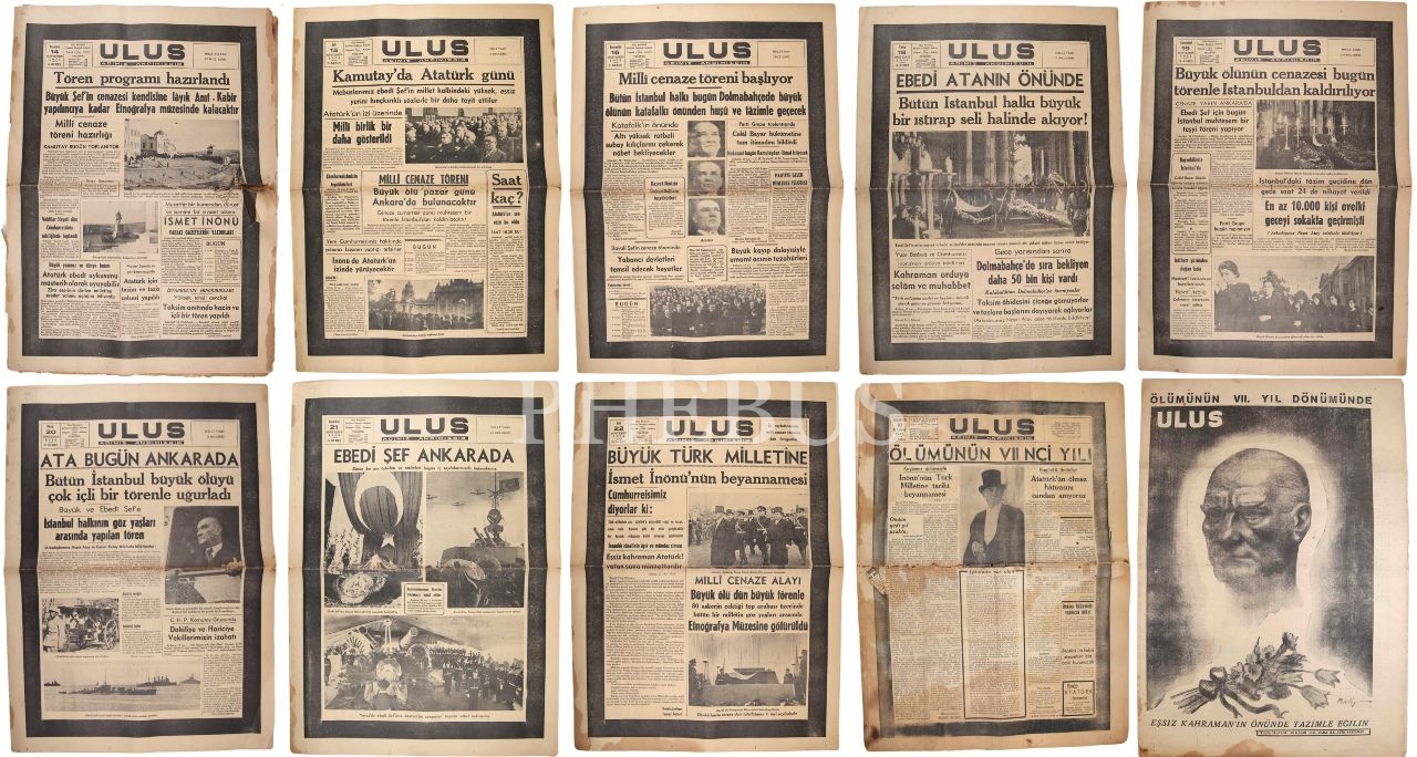 Mustafa Kemal Atatürk'ün Vefatını Takiben Yayınlanan 14-15-16-18-19-20-21-22 Kasım 1938 Tarihli Ulus Gazeteleri, ve 10 Kasım 1945 Tarihli Ulus Gazetesi, 9 adet, bazı gazeteler haliyle, 43x60 cm