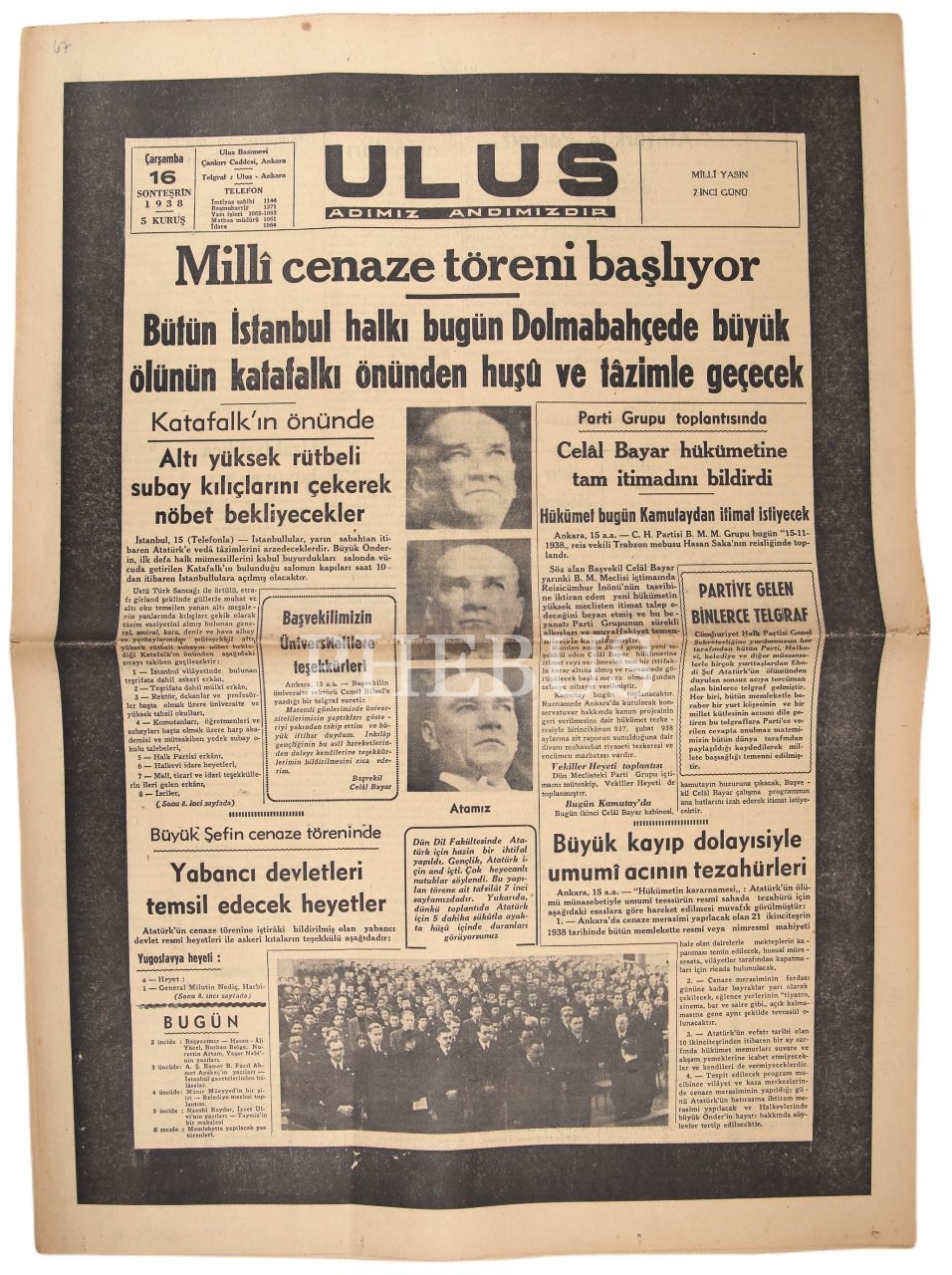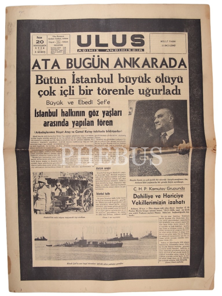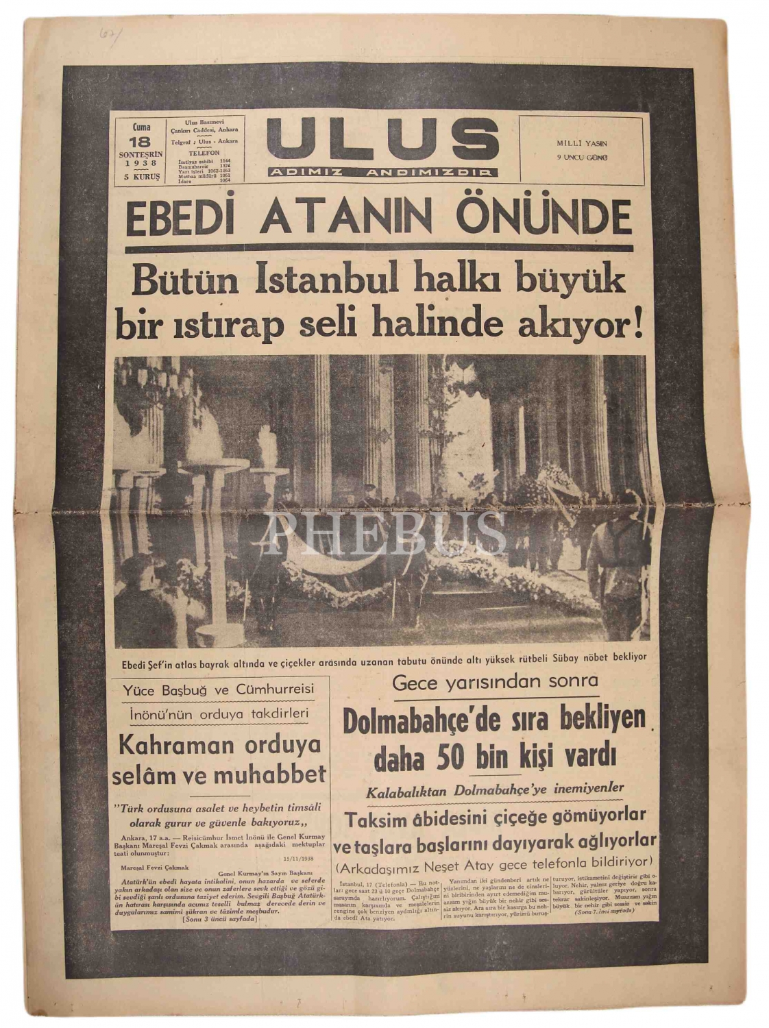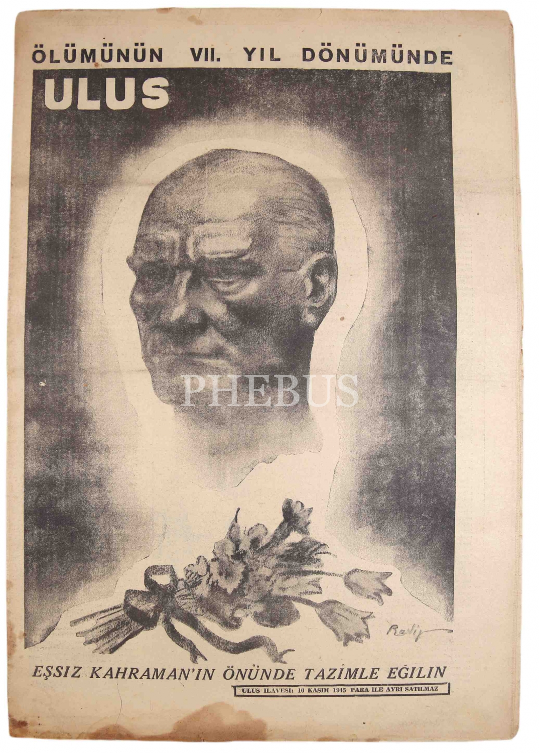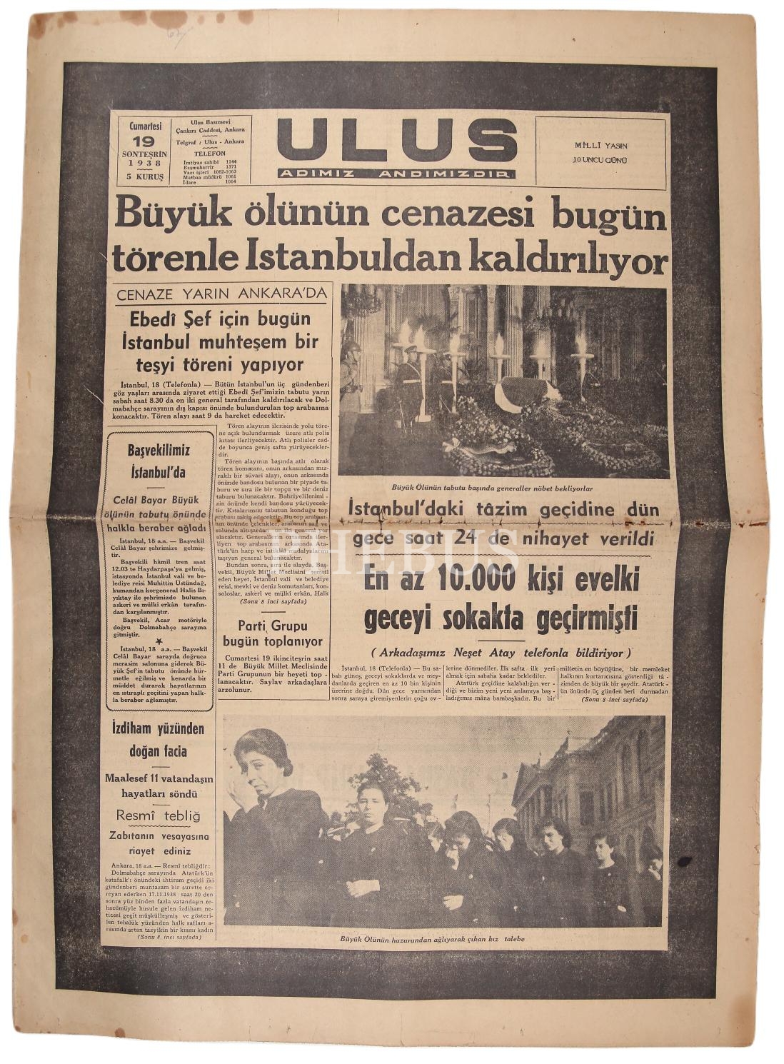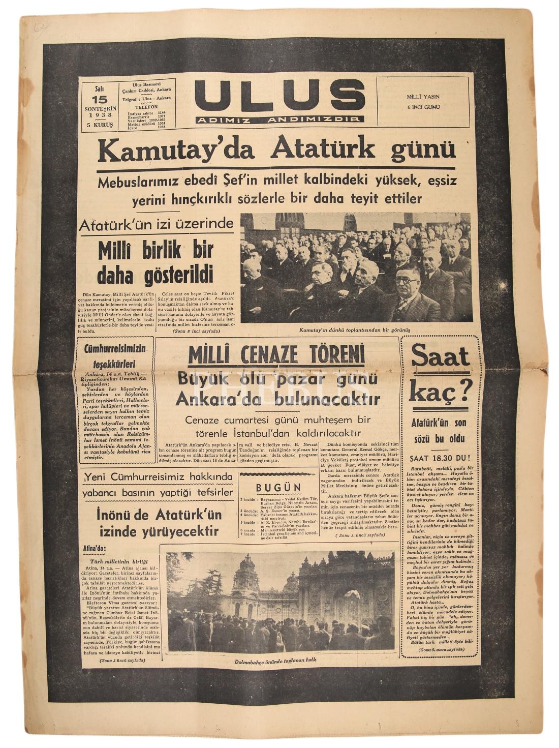 Mustafa Kemal Atatürk'ün Vefatını Takiben Yayınlanan 14-15-16-18-19-20-21-22 Kasım 1938 Tarihli Ulus Gazeteleri, ve 10 Kasım 1945 Tarihli Ulus Gazetesi, 9 adet, bazı gazeteler haliyle, 43x60 cm