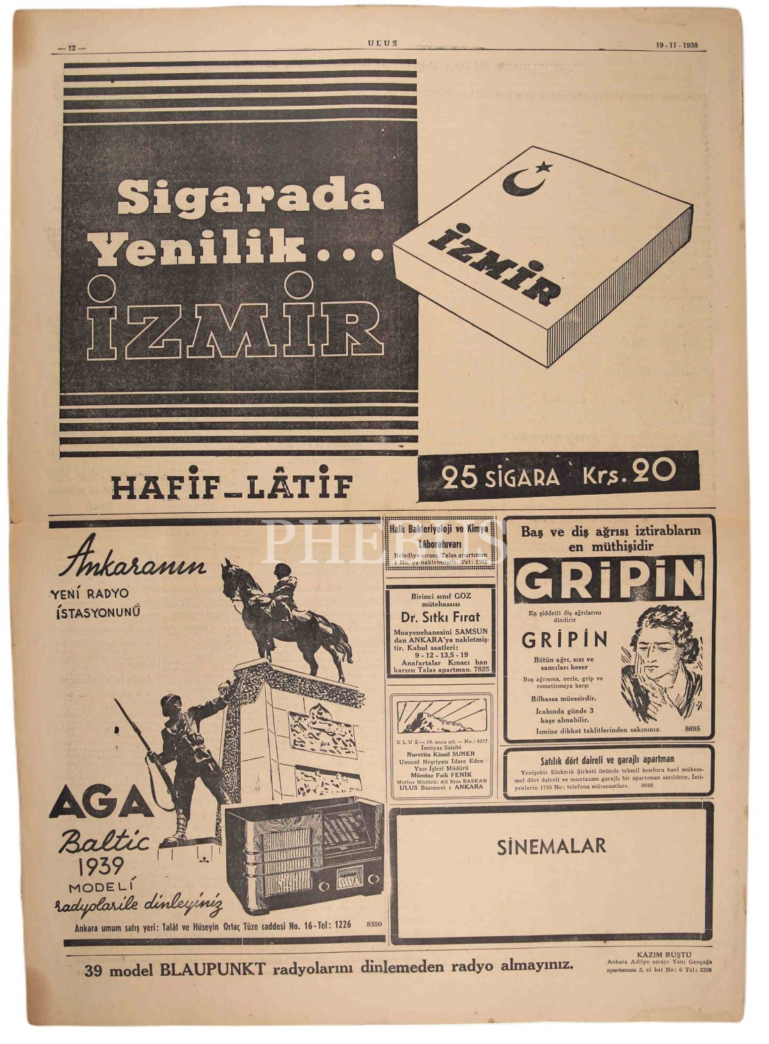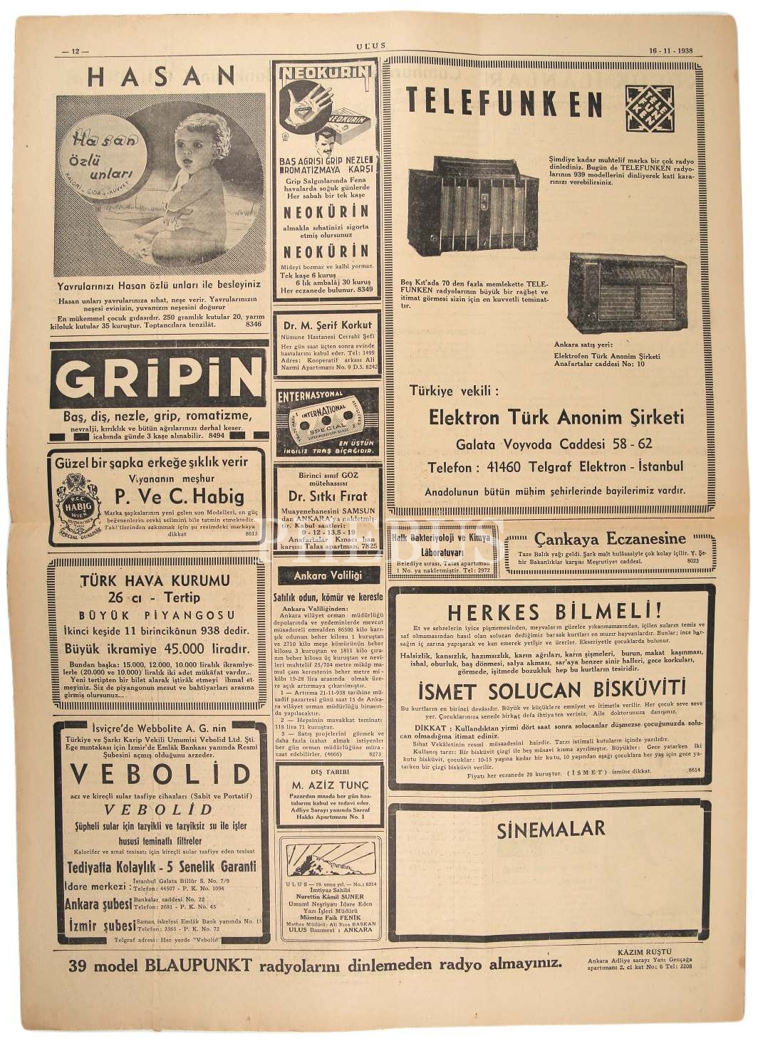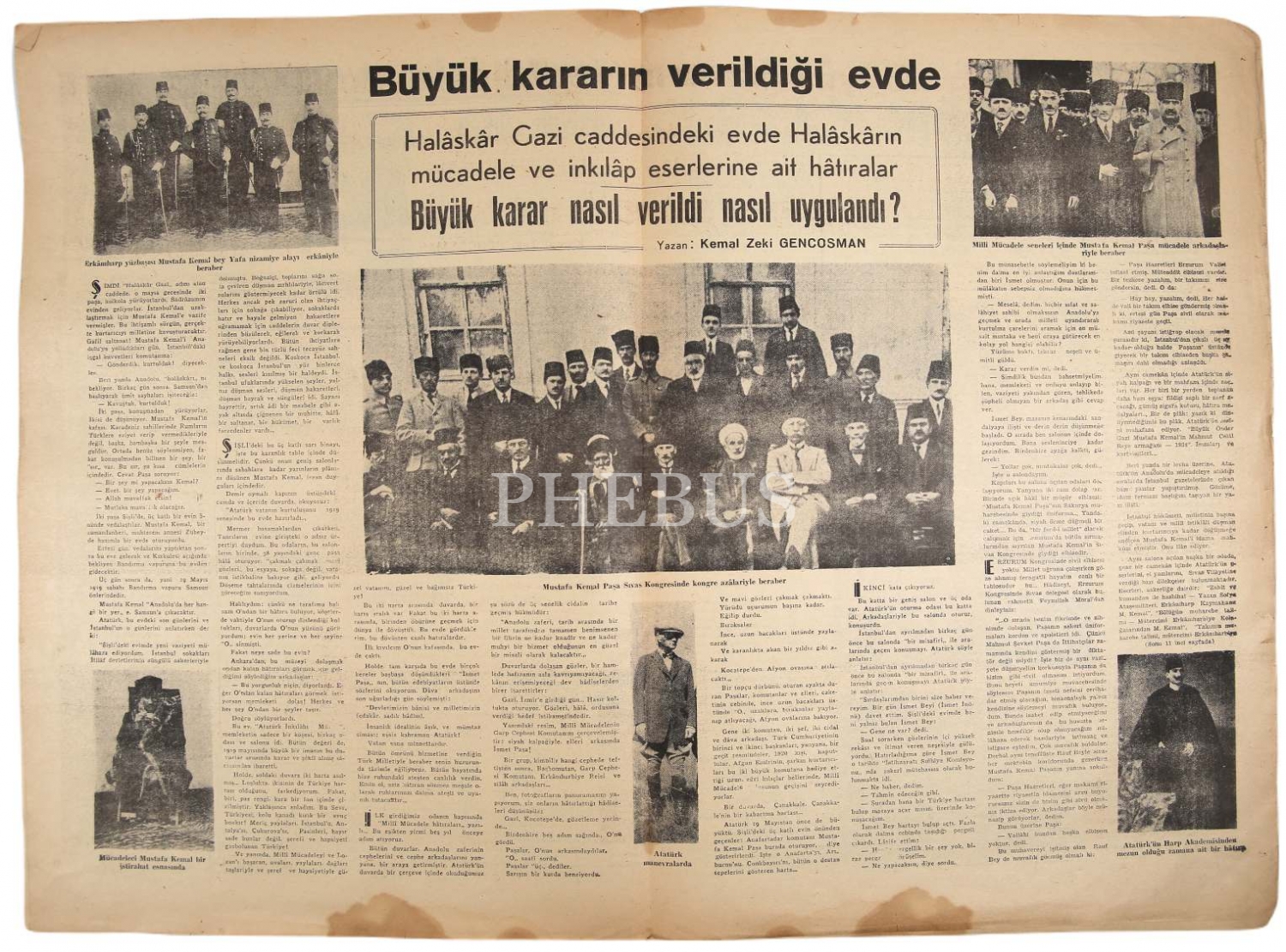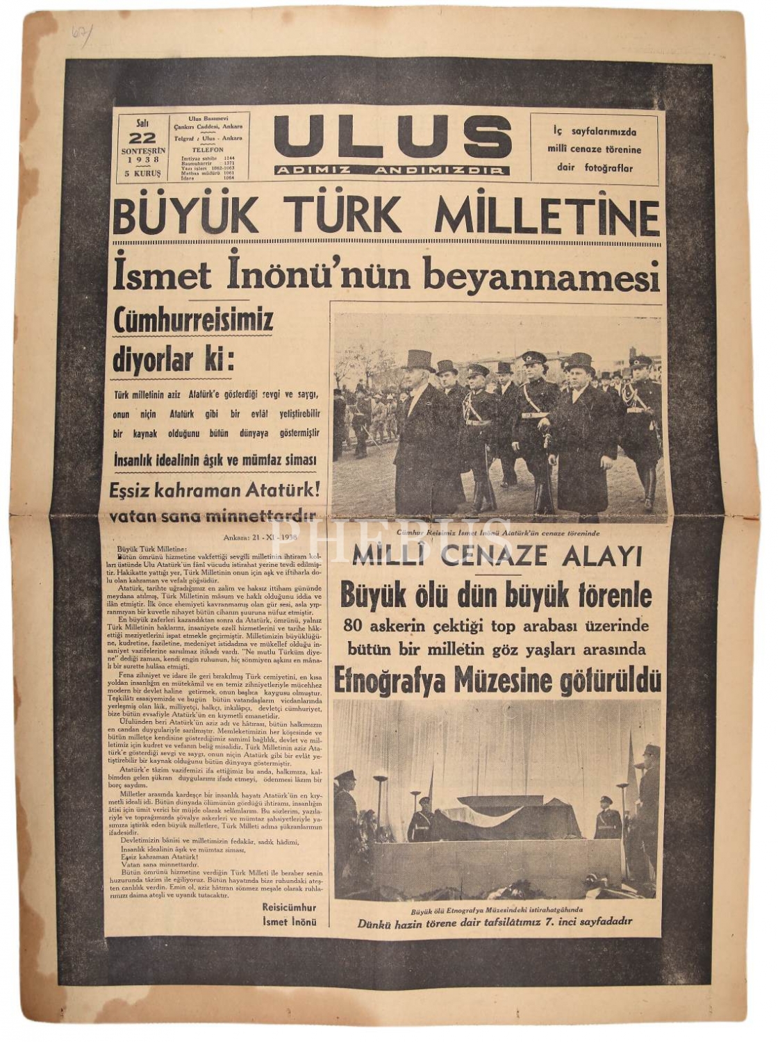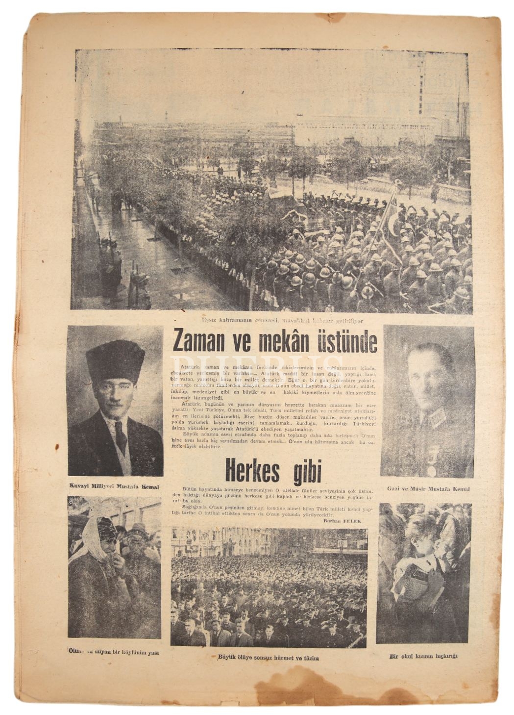 Mustafa Kemal Atatürk'ün Vefatını Takiben Yayınlanan 14-15-16-18-19-20-21-22 Kasım 1938 Tarihli Ulus Gazeteleri, ve 10 Kasım 1945 Tarihli Ulus Gazetesi, 9 adet, bazı gazeteler haliyle, 43x60 cm