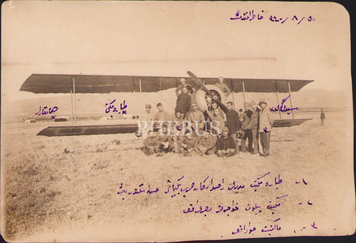 İzmir Seydiköy Tayyare Mektebi ile Müdürü Hasan İskender Bey ve Pilotlar, 1340 tarihli, 17x12 cm