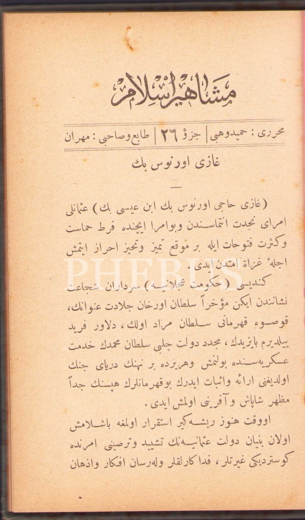 Osmanlı Devlet Armalı ve Ay-Yıldızlı Osmanlıca Gazi Evrenoszade Ali Bey yazılı cildinde Meşahir-i İslam'ın Evrenos Bey Bölümü, 11x18 cm