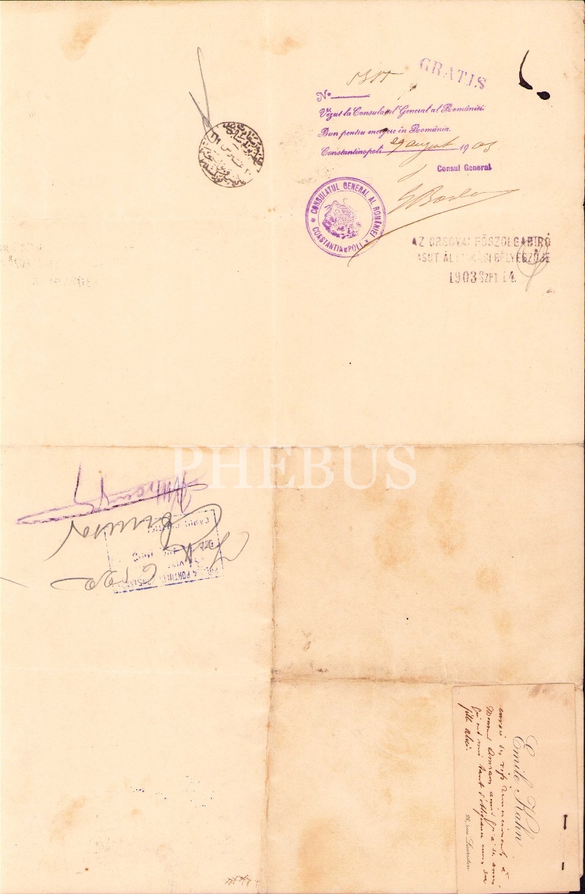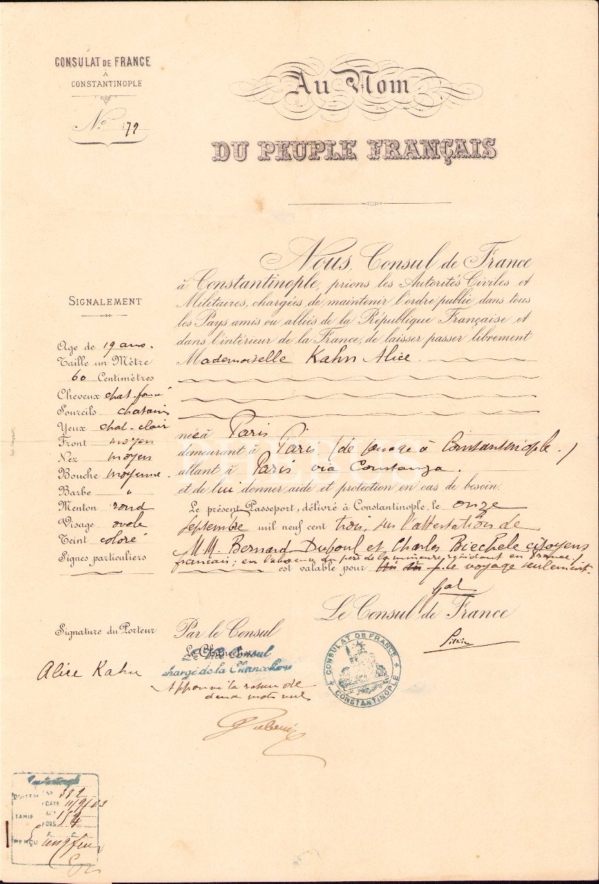 İstanbul Fransız Konsolosluğu Tarafından Verilmiş Fransızca Kimlik Belgesi, Alice Khan'a ait, 1903 tarihli, 28x40 cm