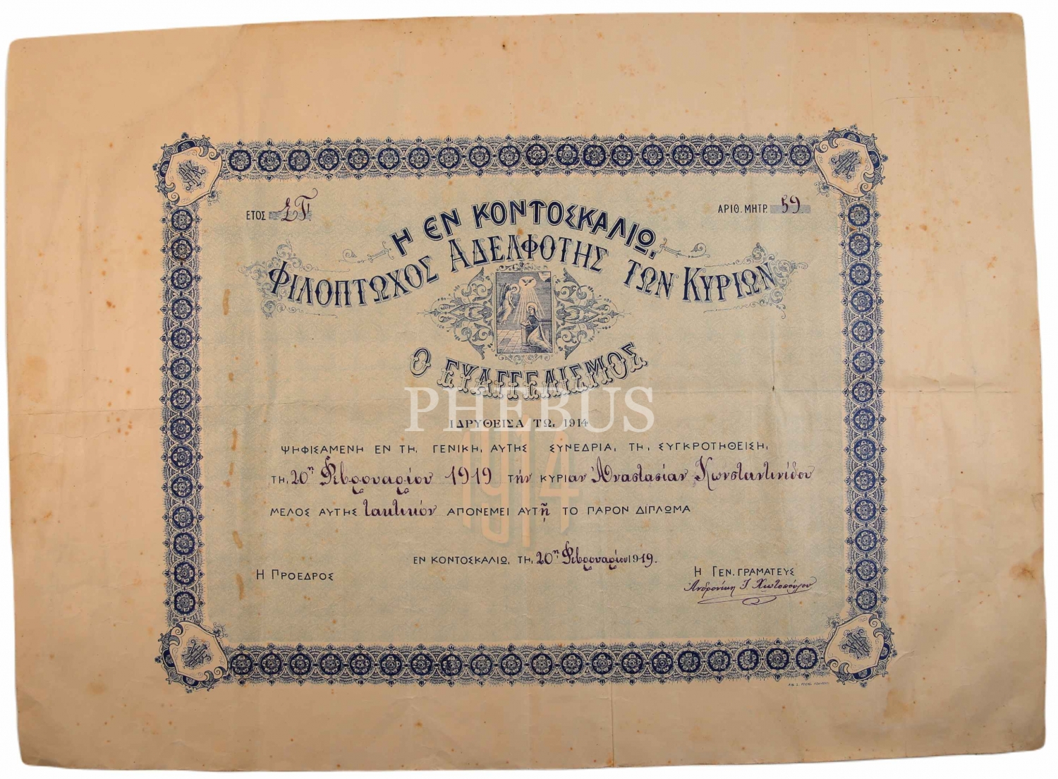 Rumca Kumkapı Yardım Cemiyeti Diploması, 1914 tarihli, 60x40 cm