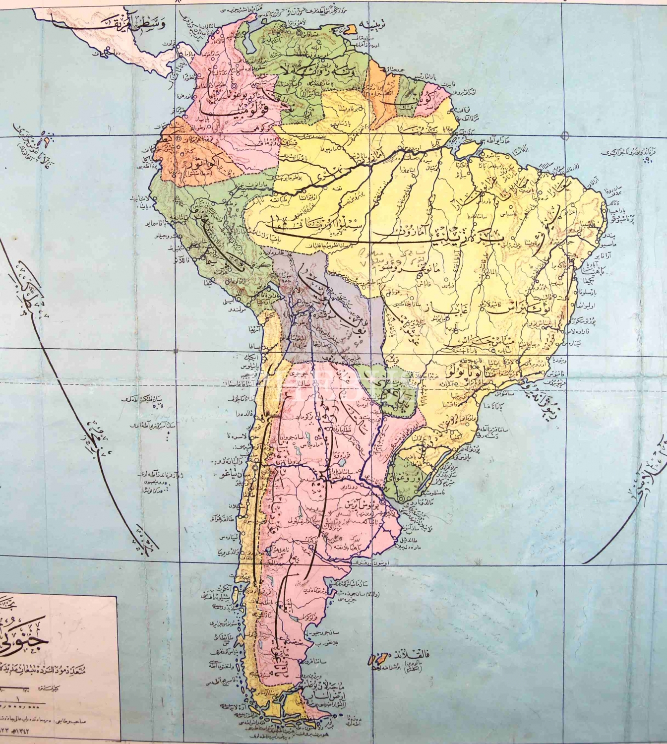 Osmanlıca Güney Amerika Haritası, Sirkeci'de Yeni Dünya Matbaası'nda basılmış, 1923 tarihli, 82x60 cm