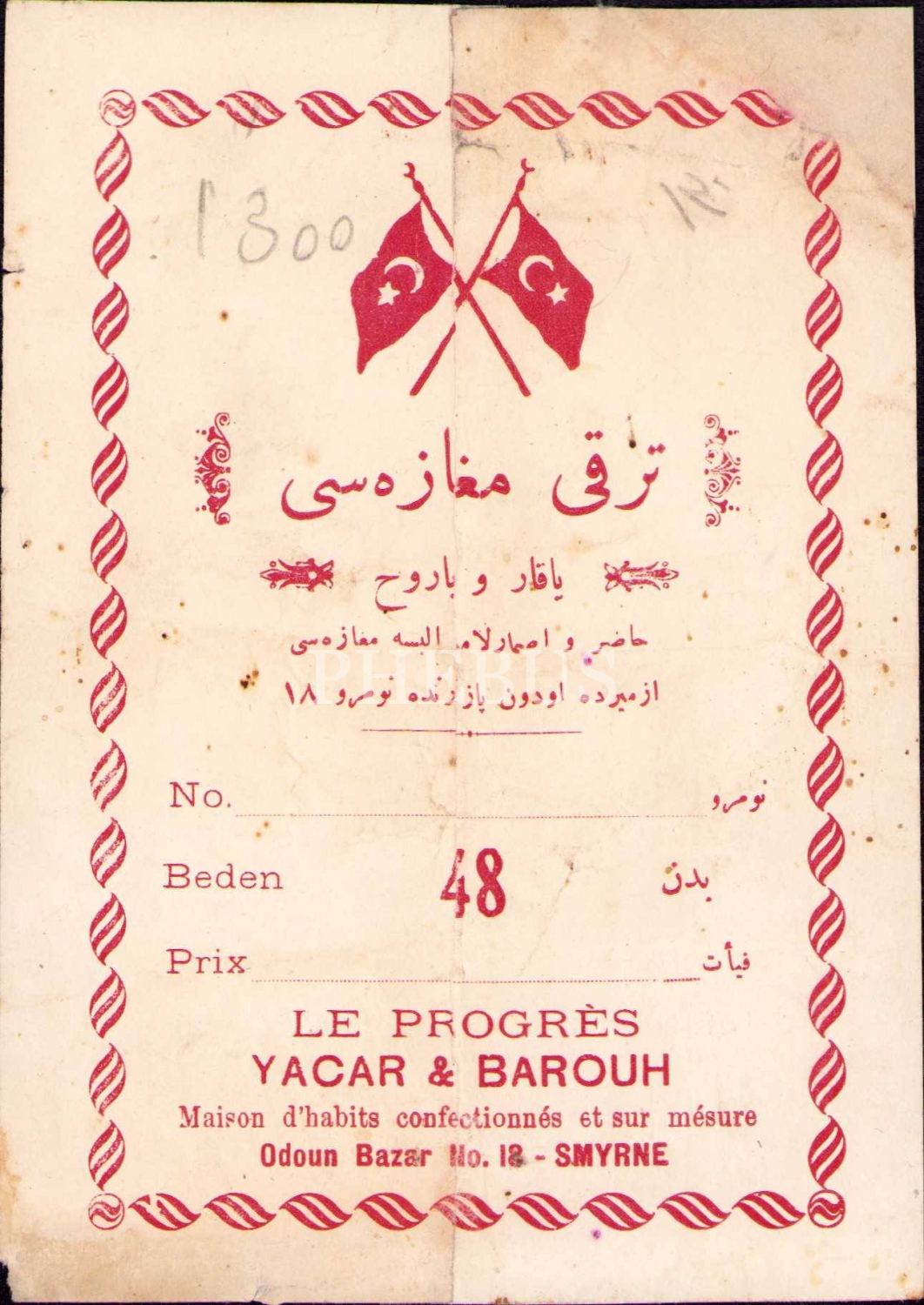 Osmanlıca ve Fransızca Terakki Elbise Mağazası etiketi, Musevi Yakar ve Baruh, beden ve fiyatlar yazmakta, İzmir Odunpazarı'nda, 11x16 cm