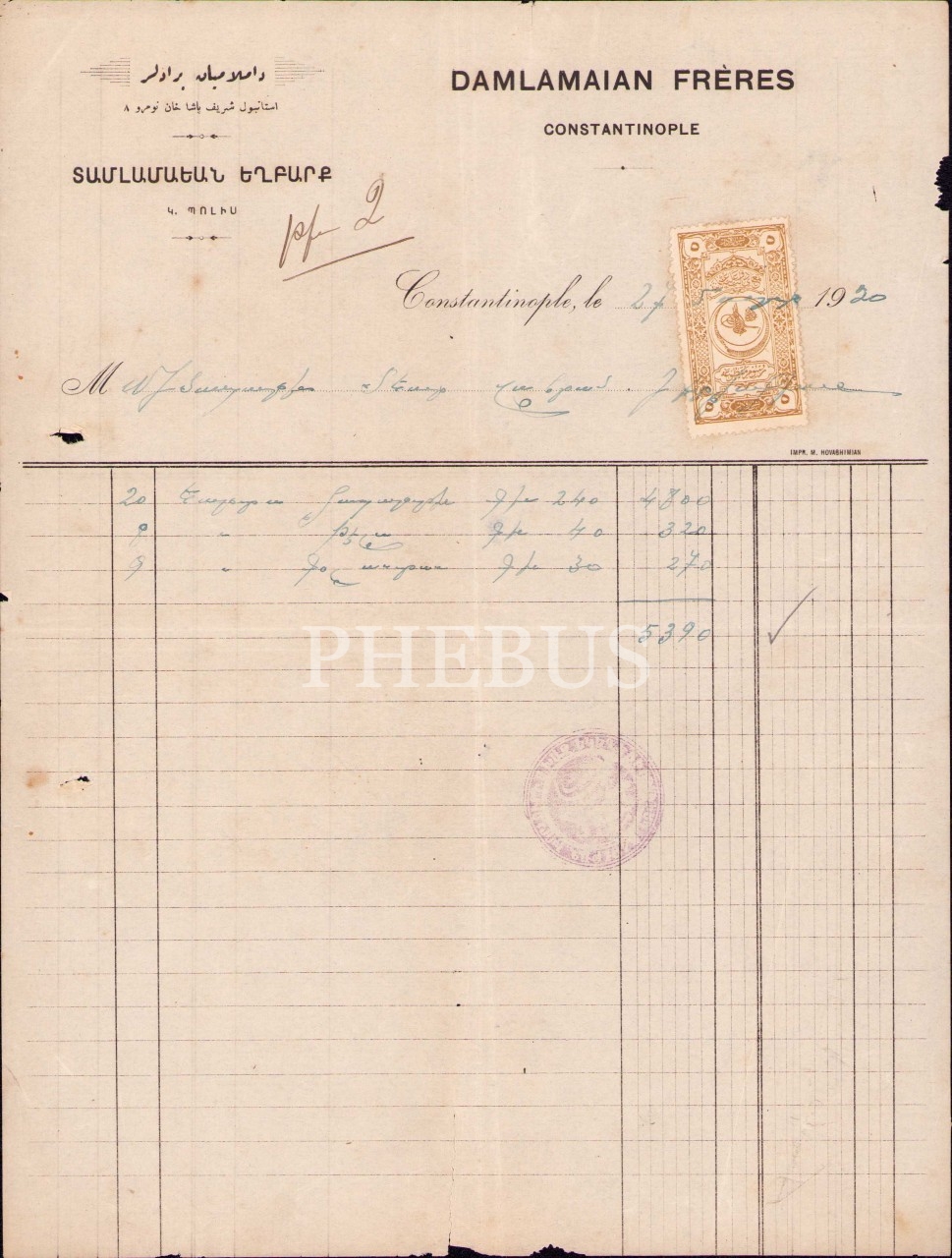 Osmanlıca Fransızca ve Ermenice Damlamaian Freres [Damlamayan Birederler] Constantinople antetli fatura, 21x28 cm