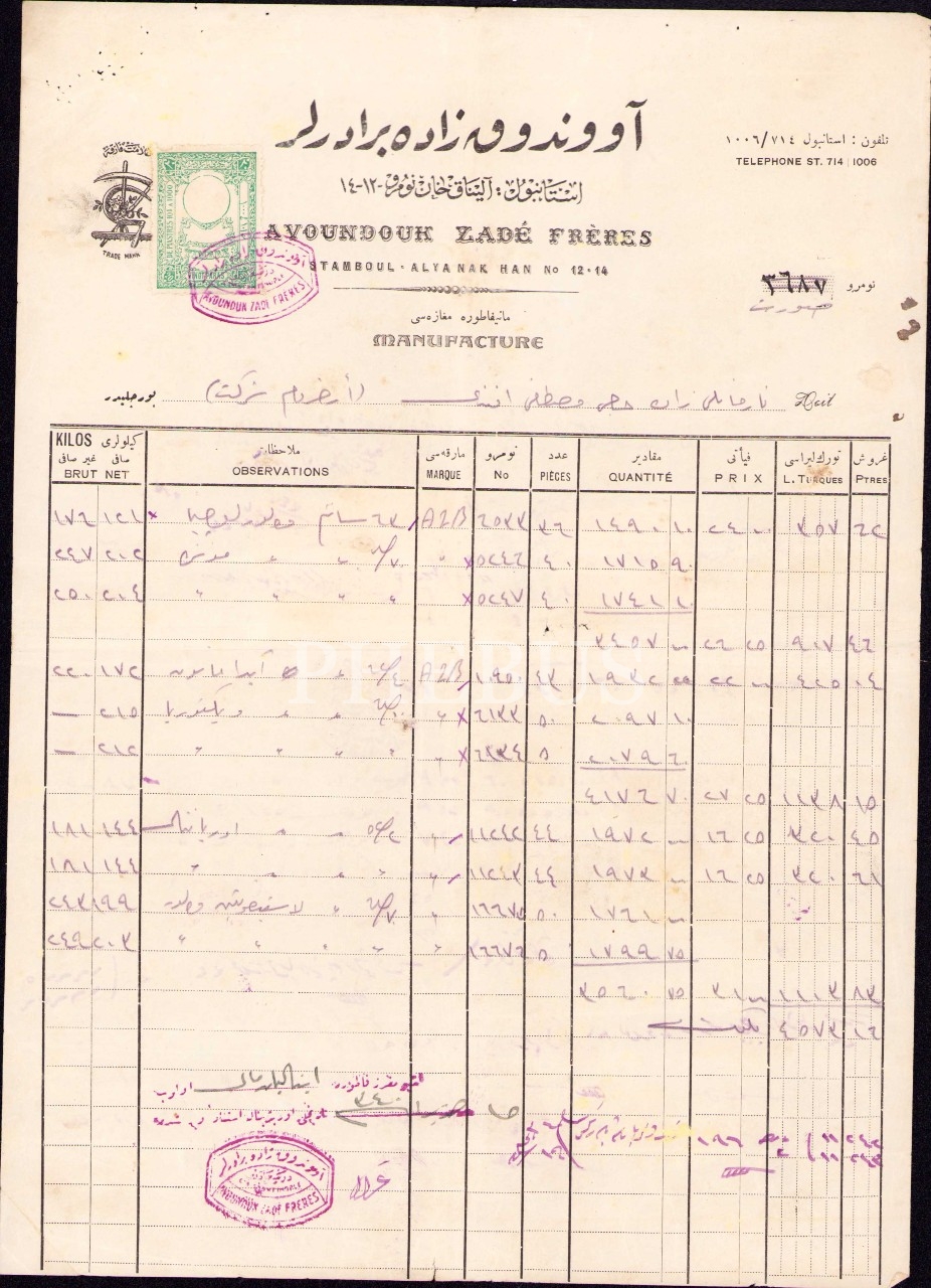 Osmanlıca ve Fransızca Avundukzade Kardeşler Antetli Fatura, 23x32 cm