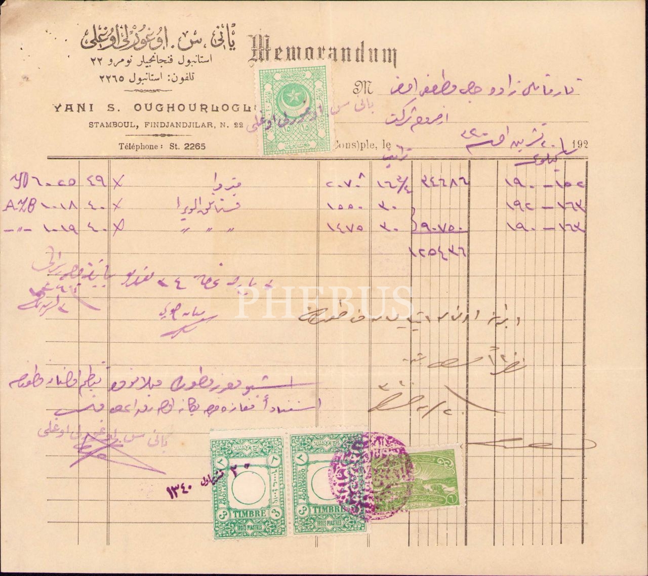 Osmanlıca Yani S. Uğurluoğlu İstanbul Antetli Fatura, 1340 tarihli, 21x20 cm