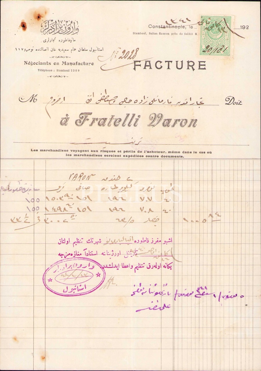 Osmanlıca ve Fransızca Fratelli Varon Antetli Fatura, 1920'ler, 20x28 cm