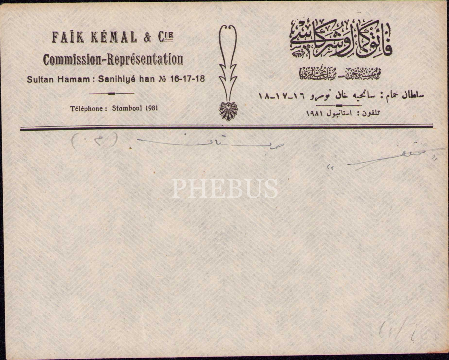 Osmanlıca ve Fransızca Komisyoncu Faik Kemal Antetli Fatura antetli zarf, 15x12 cm