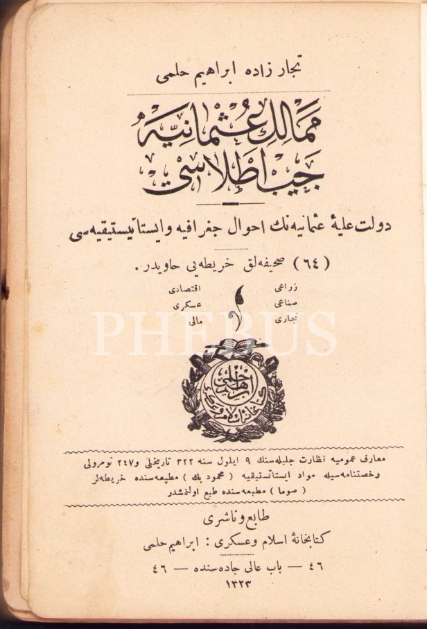 Memalik-i Osmaniye Cep Atlası, Devlet-i Aliyye-i Osmaniye'nin Ahval-i Coğrafya ve İstatikiyesi, Zirai, Sanayi, Ticari ve İktisadi, İbrahim Hilmi, İstanbul, Kitabhane-i İslam ve Askeri, 1323 tarihli, 24 harita mevcut, 328+64 sayfa, 11,5x16,5 cm