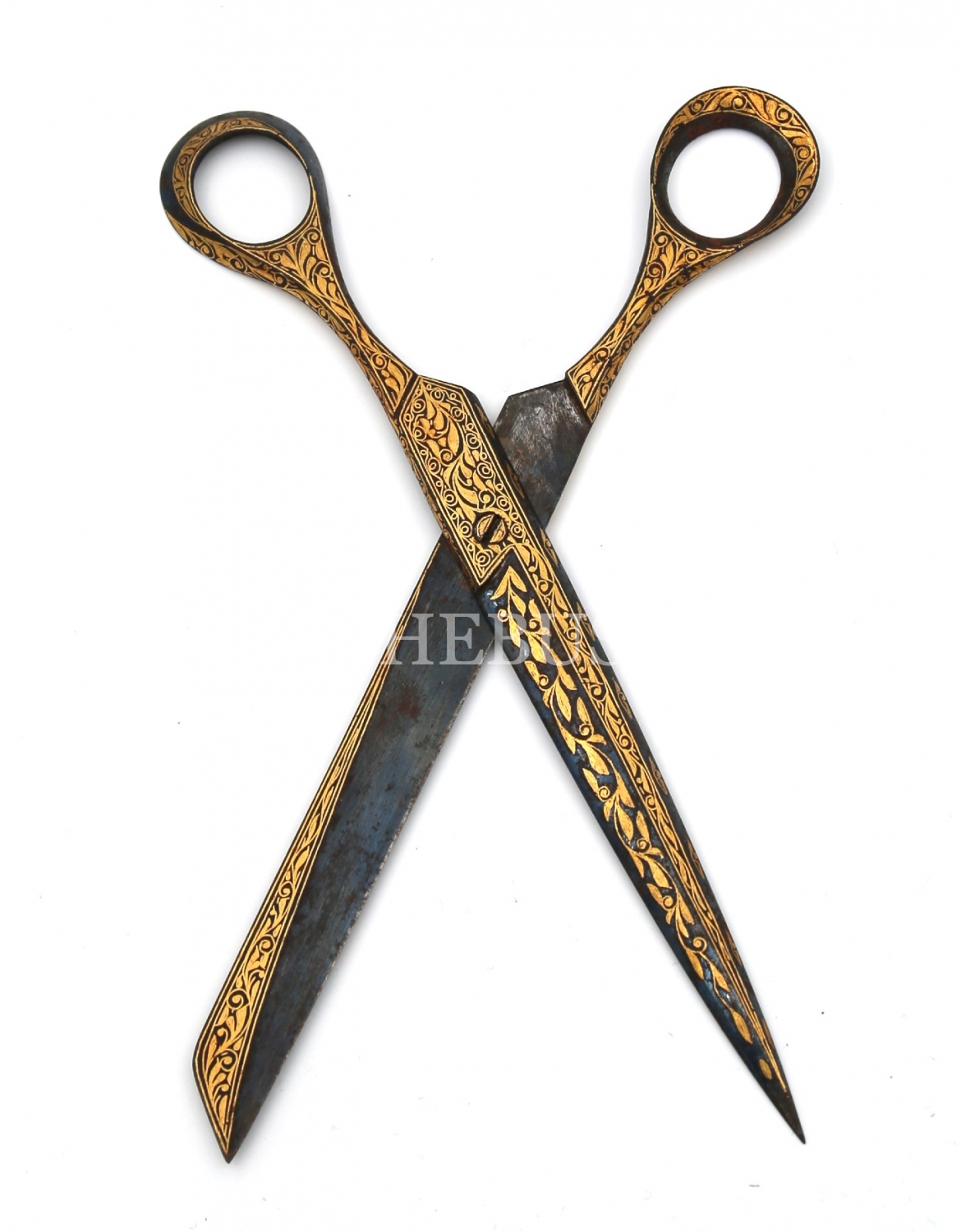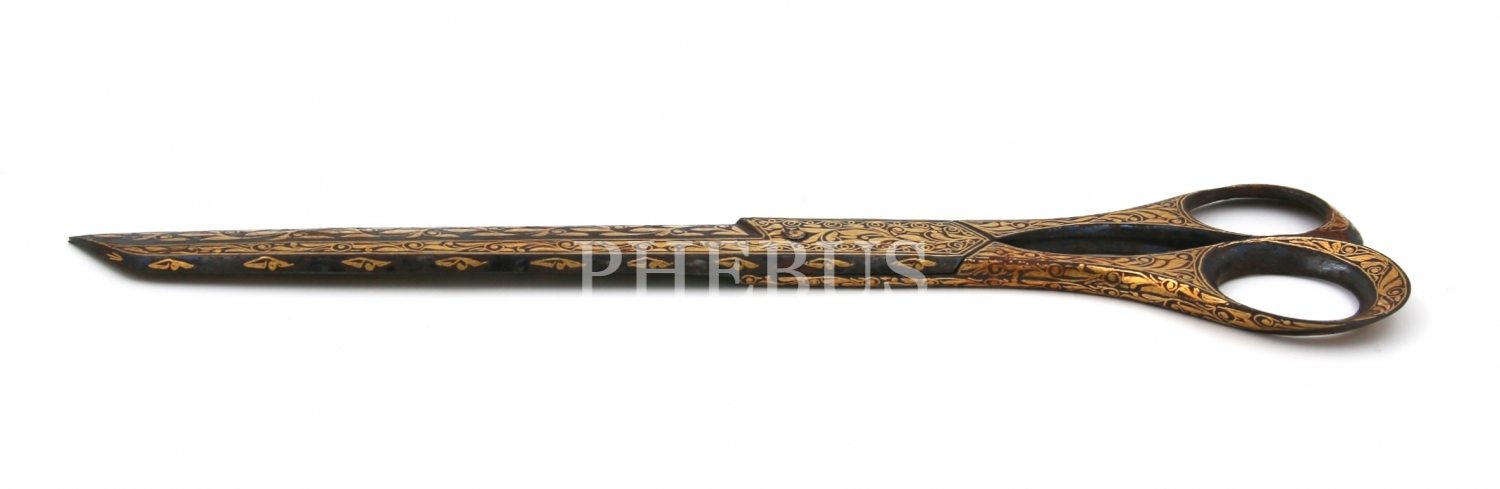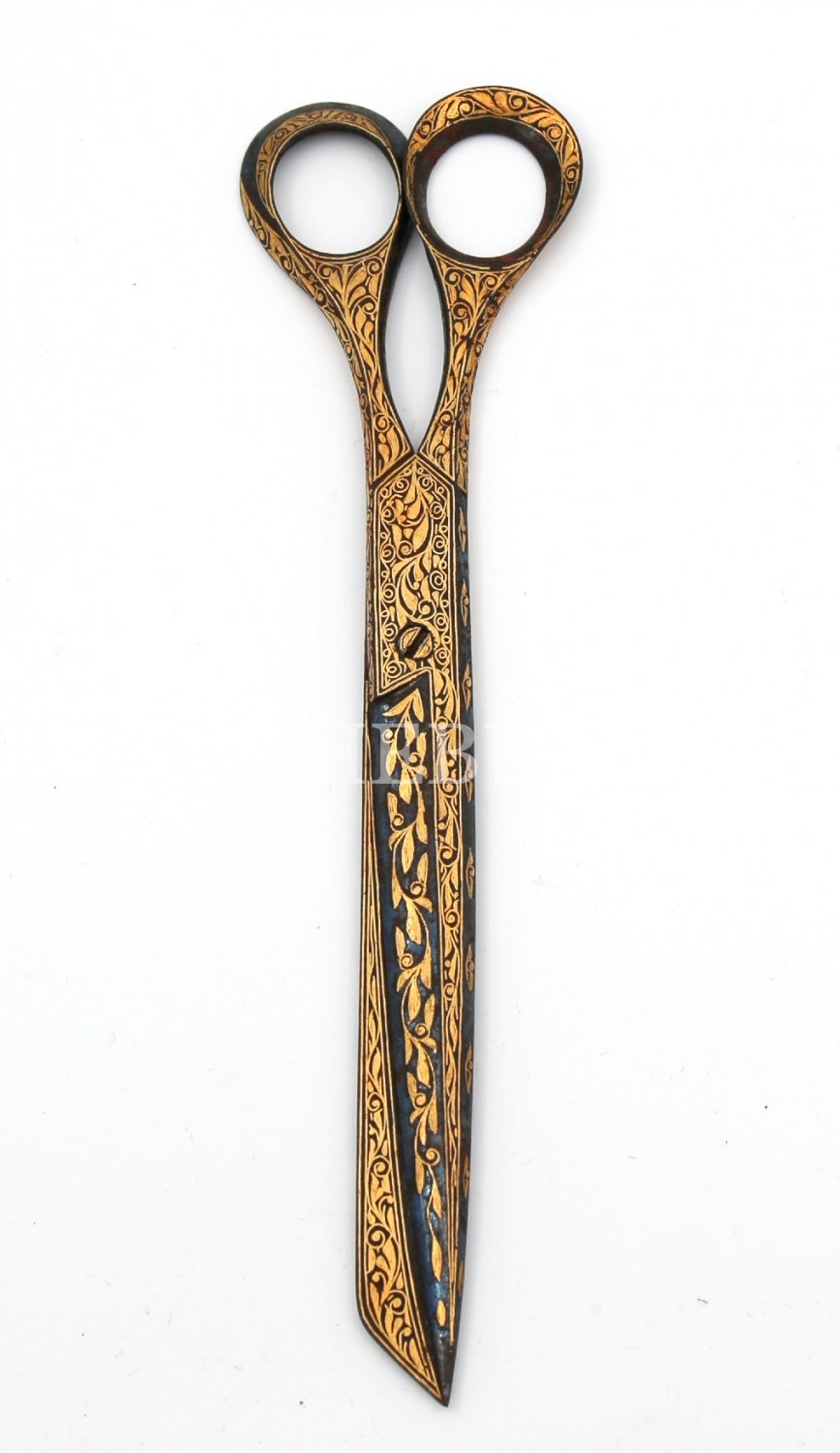 Osmanlı Dönemi Demir Üzerinde Altın Hatai Desen İşçilikli Hattat Makası, 2x20 cm