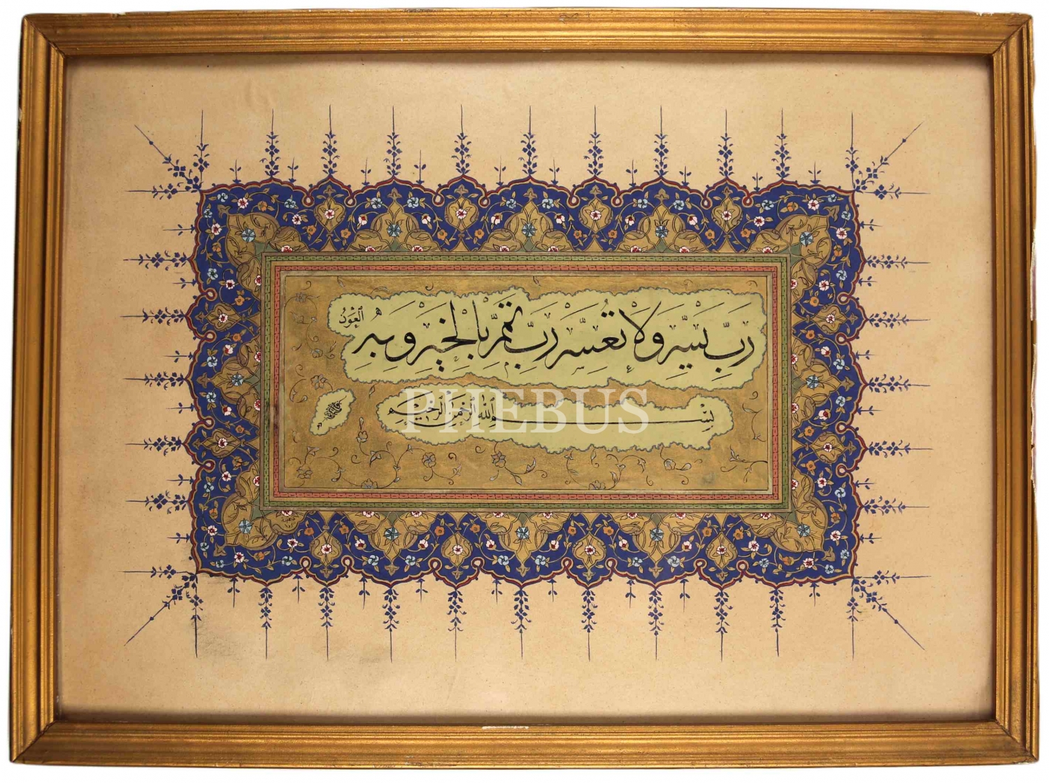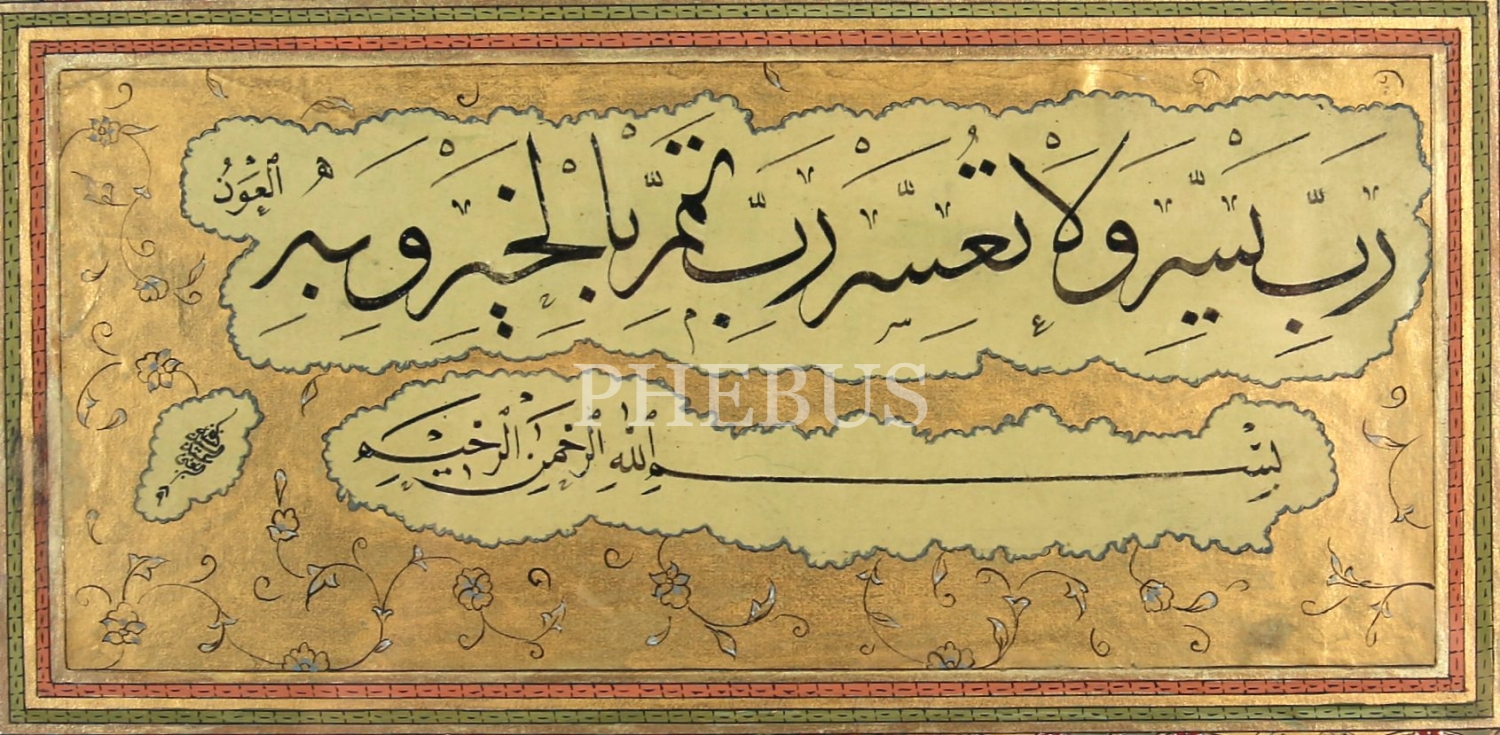 Sülüs Rabbi Yessir ve Nesih Besmele, On Yedinci Asır Hattatlarından Seyyid Abdülgani Efendi ketebeli, tezhipli, çerçeveli, yazı 17x8 cm