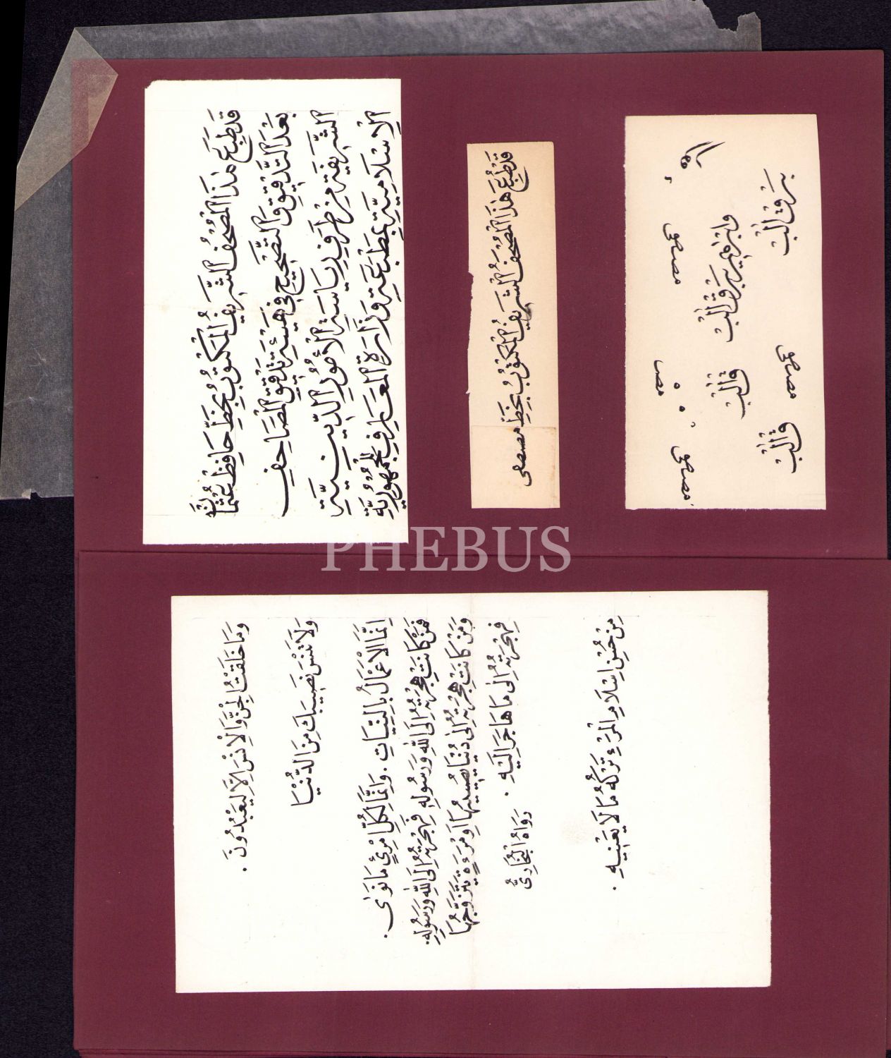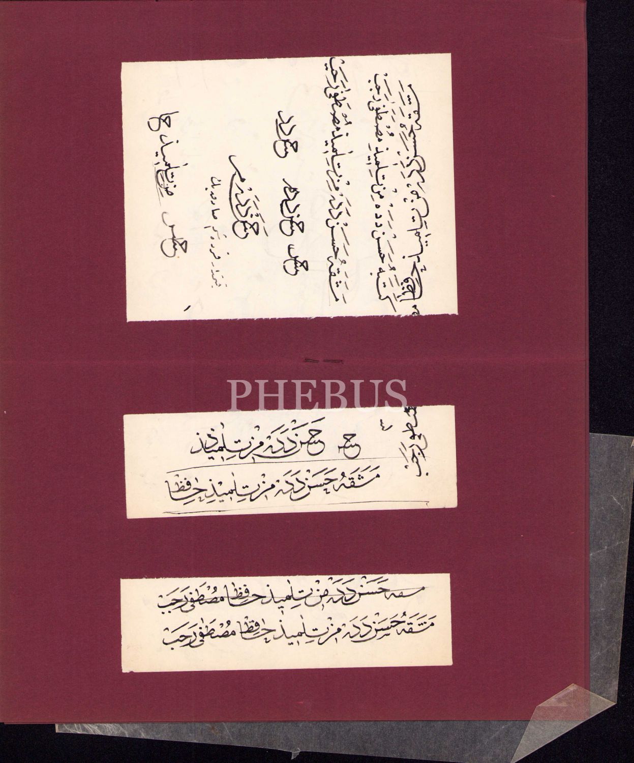 Sülüs Nesih Meşk Derlemesi, yapıştırılmış 10 parça halinde, Hafız Mustafa Recep talebesi Hasan Dede'nin ketebeleri mevcut, Baskıya hazırlanan birr mushafın taslağı mevcuttur, muhtelif ebatlarda