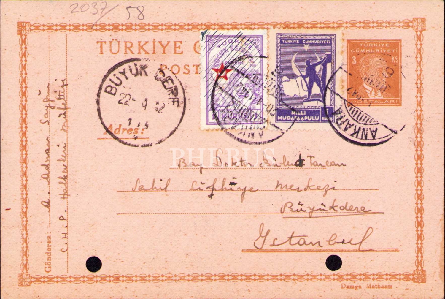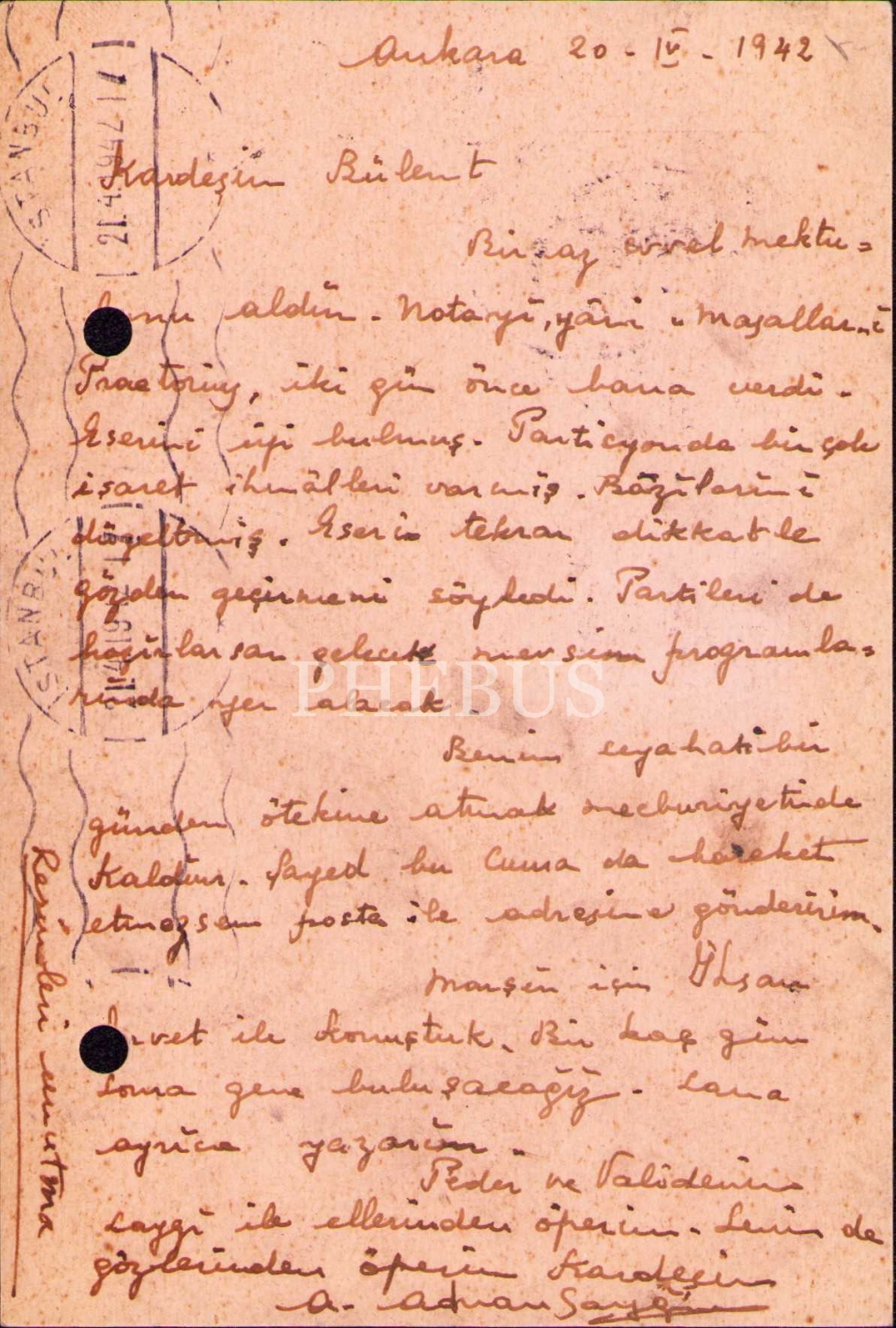 İlk Türk Opera Bestecisi "Türk Beşleri"nden Ahmed Adnan Saygun'un Besteci Prof. Dr. Bülent Tarcan'a gönderdiği şahsi mektup kartı, Ankara 1942, 10x15 cm