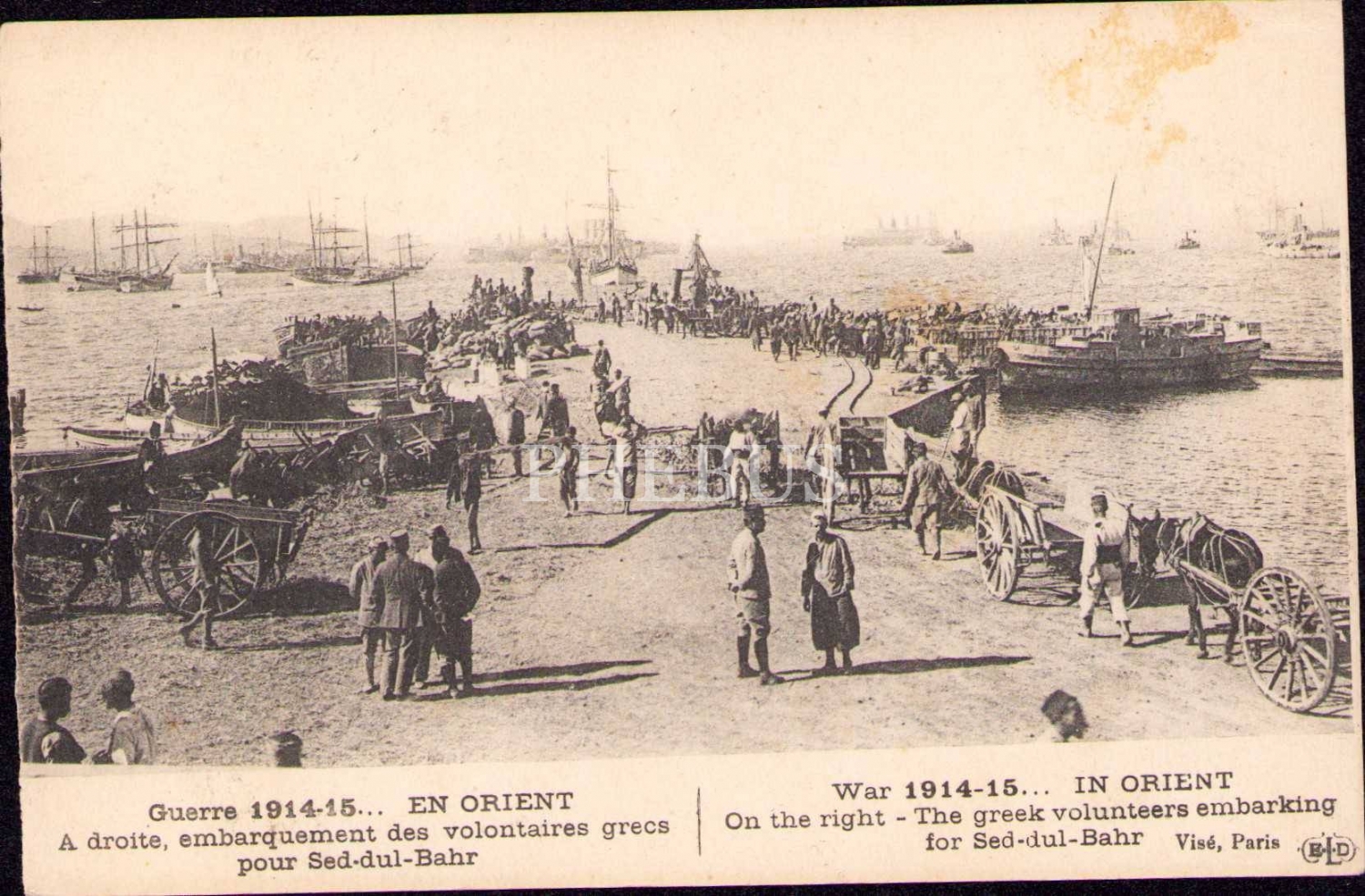 1914-15 Savaşı esnasında Seddülbahir için yola çıkan Yunan gönüllüleri gösterir İngilizce ve Fransızca kart, E. Le Deley, Paris