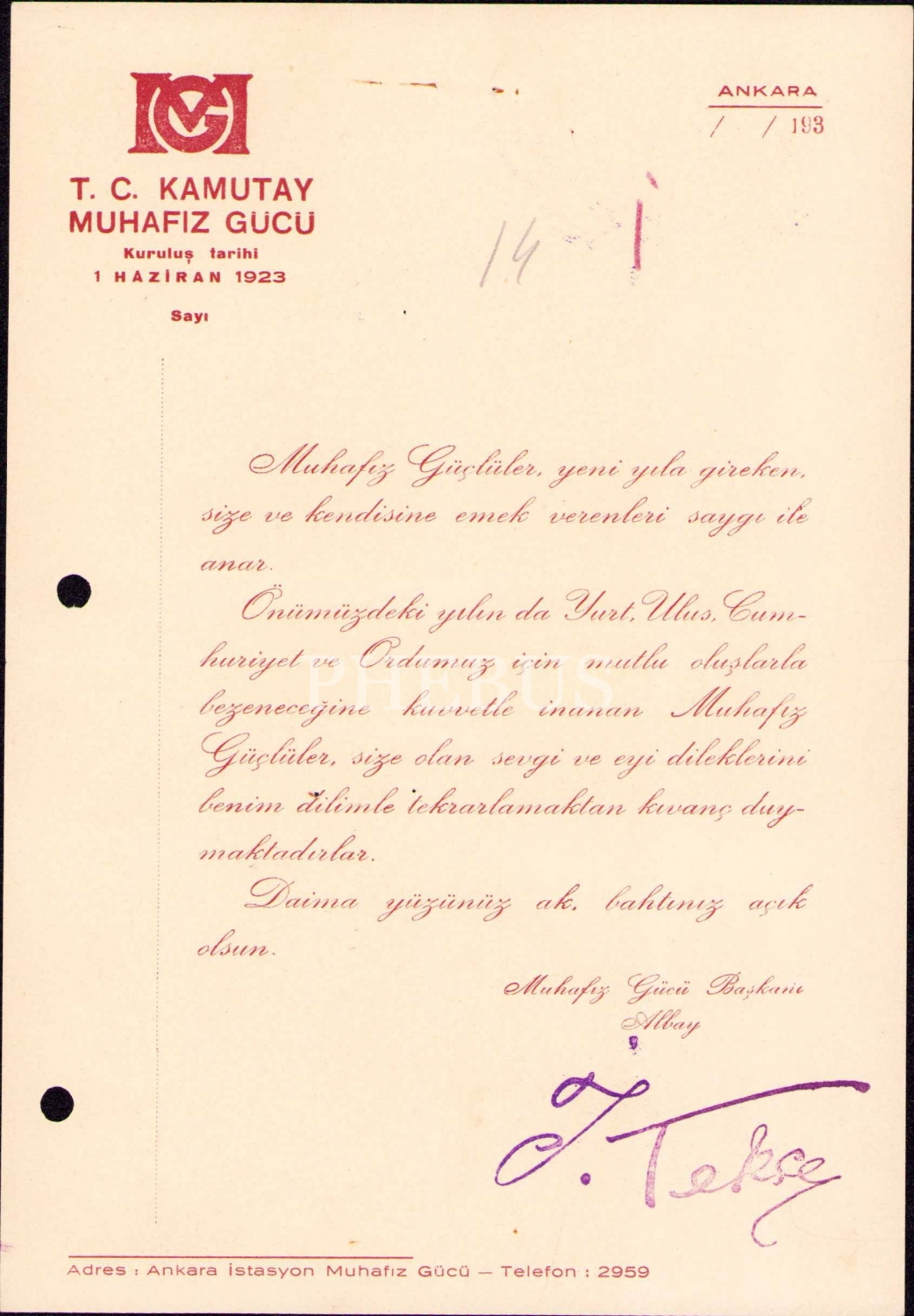 T.C. Kamutay Muhafız Gücü antetli, Albay İsmail Hakkı Tekçe imzalı yeni yıl tebrik kağıdı, Ankara, 14x20 cm