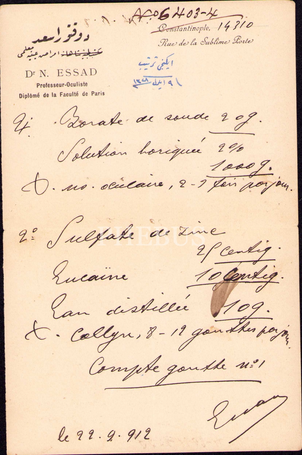 Doktor Esad antetli Osmanlıca-Fransızca reçete, 1912, 14x21 cm
