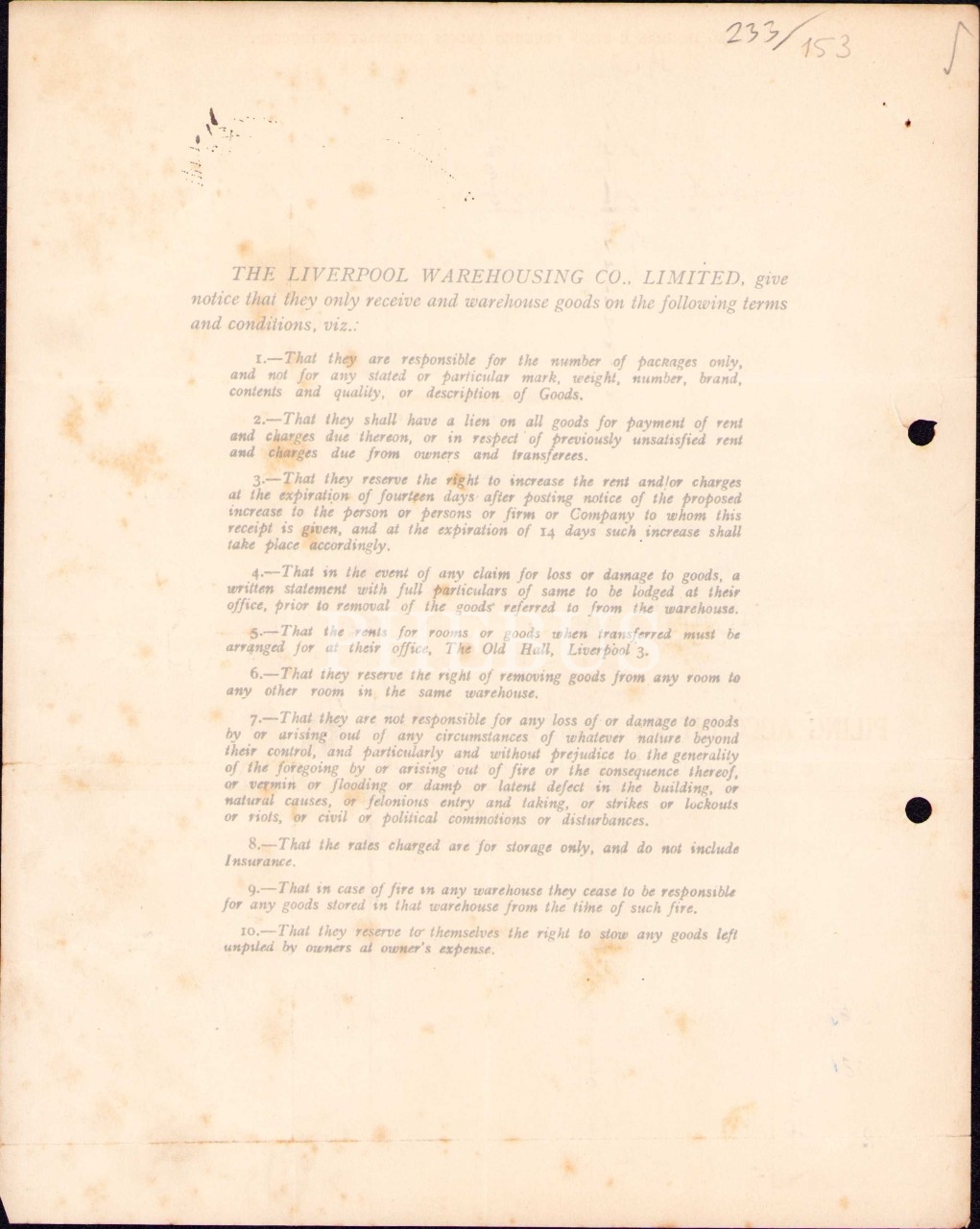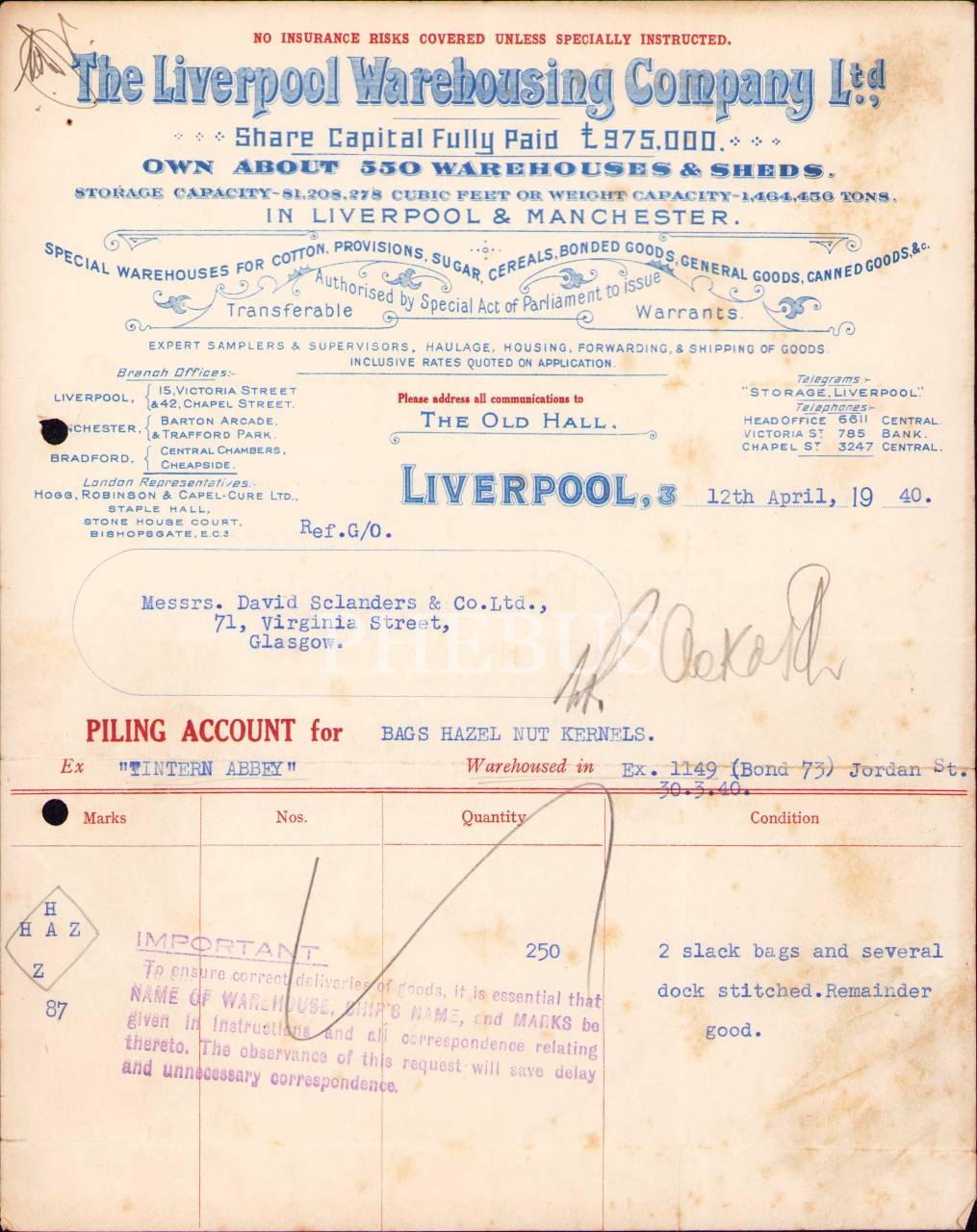 The Liverpool Warehousing Company Ltd. adlı depolama şirketine ait 1940 tarihli İngilizce belge, 21x26 cm