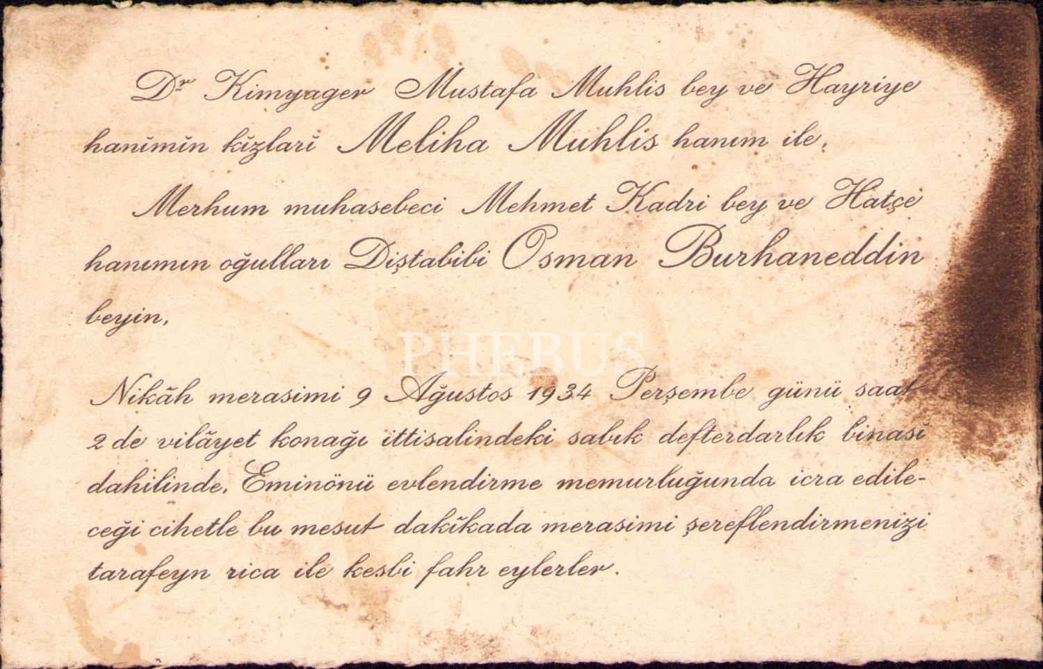 1934 tarihli nikah davetiyesi, 10x16 cm