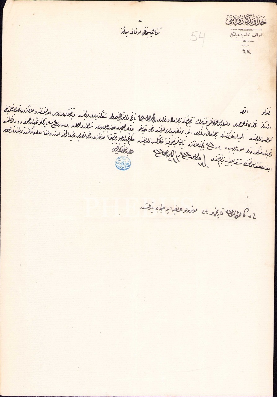 Osmanlıca Hüdavendigâr Vilayeti [Bursa] Evkaf Muhasebeciliği antetli, Kütahya Sancağı Evkaf Müdürlüğüne gönderilmiş evrak, 1311, 24x34 cm