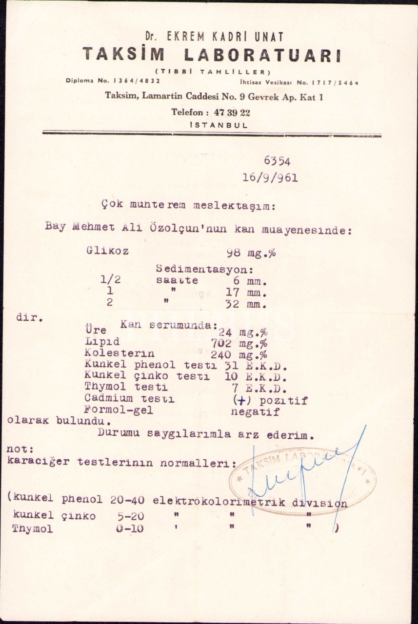 Dr. Ekrem Kadri Unat Taksim Laboratuarı antetli tahlil kağıdı, İstanbul 1961, 15x23 cm