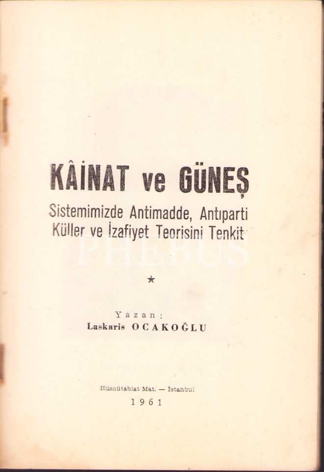 Kainat ve Güneş (Sistemimizde Antimadde, Antıpartiküller ve İzafiyet Teorisini Tenkit), Laskaris Ocakoğlu, Hüsnütablat Matbaası, İstanbul 1961, 54 sayfa, 14x20 cm